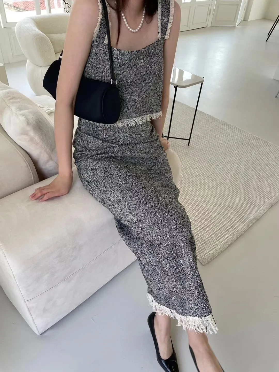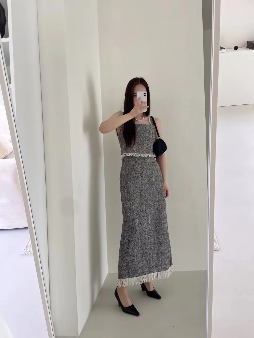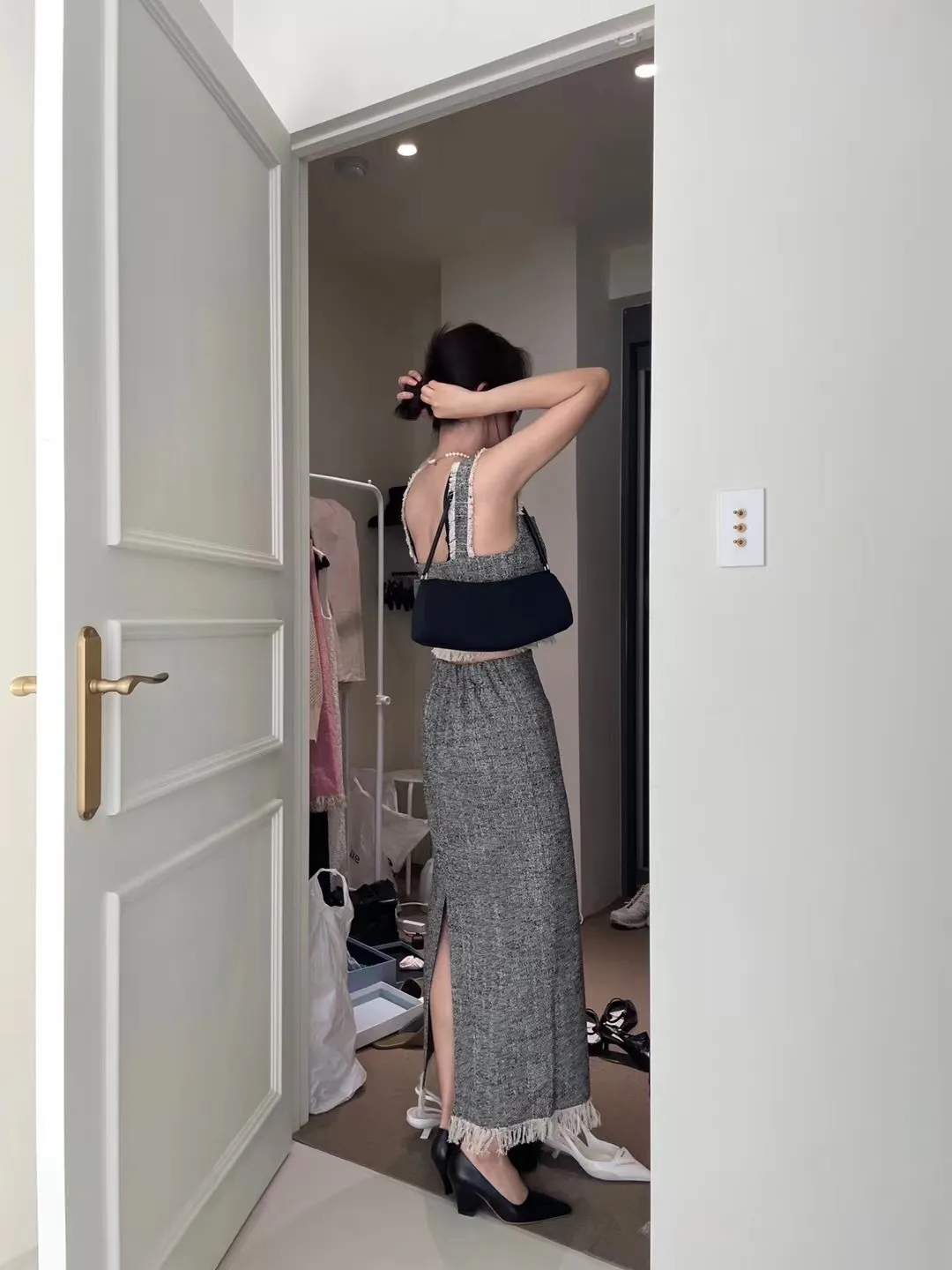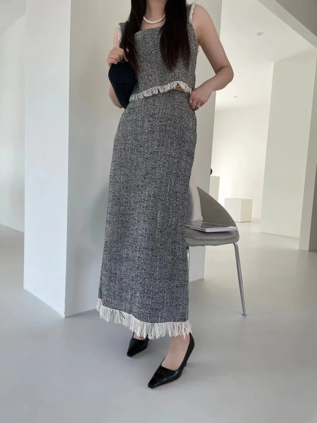 3097 夏日質感灰鬚鬚後開衩長裙(適合S~M)