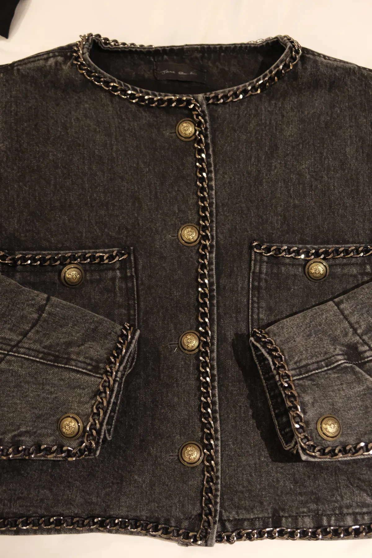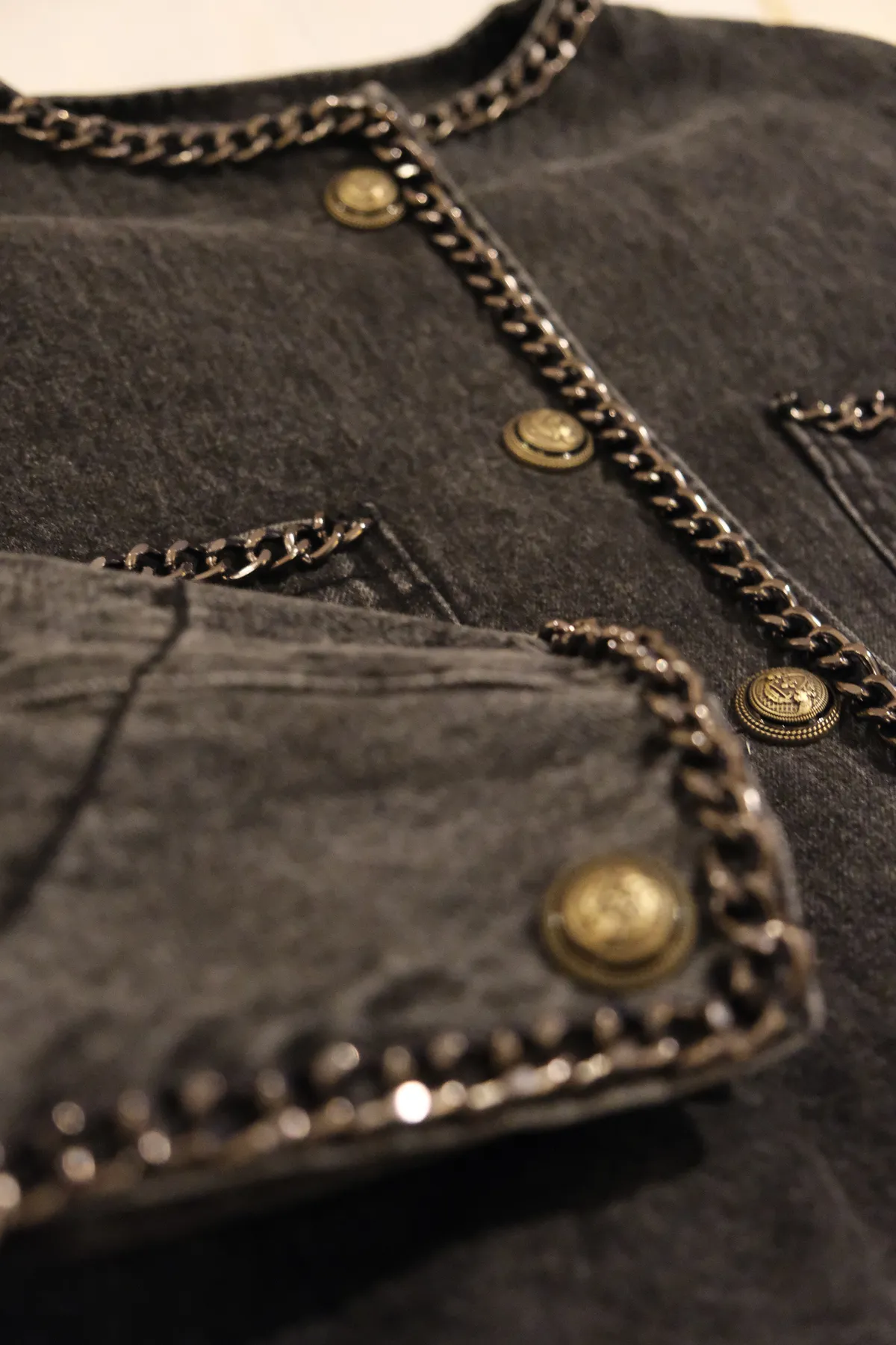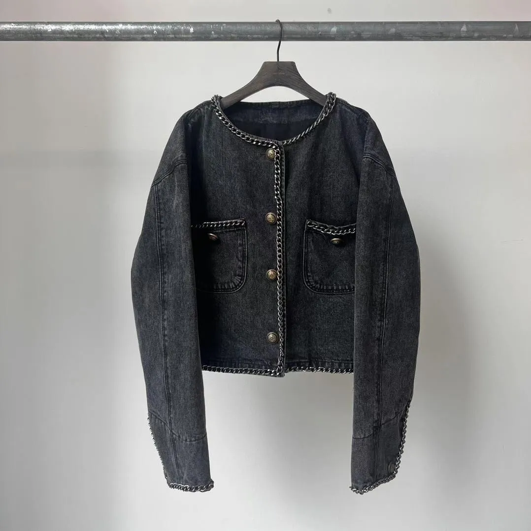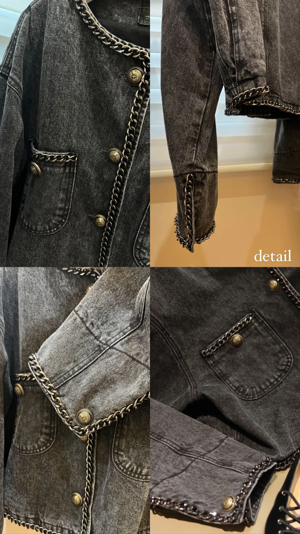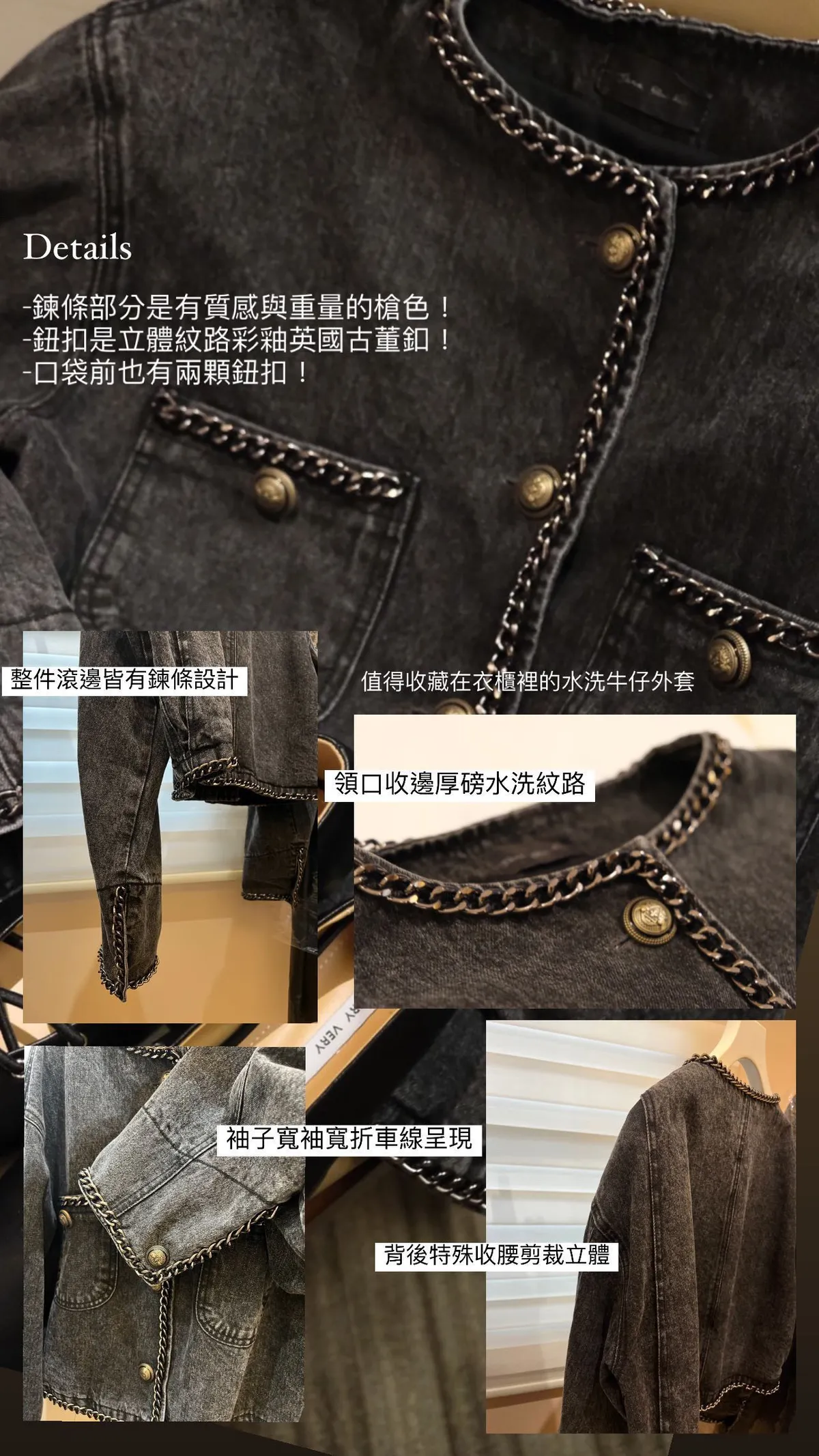 4770『加開訂製數量』牛仔外套天花板~重工鏈條高級水洗黑丹寧夾克