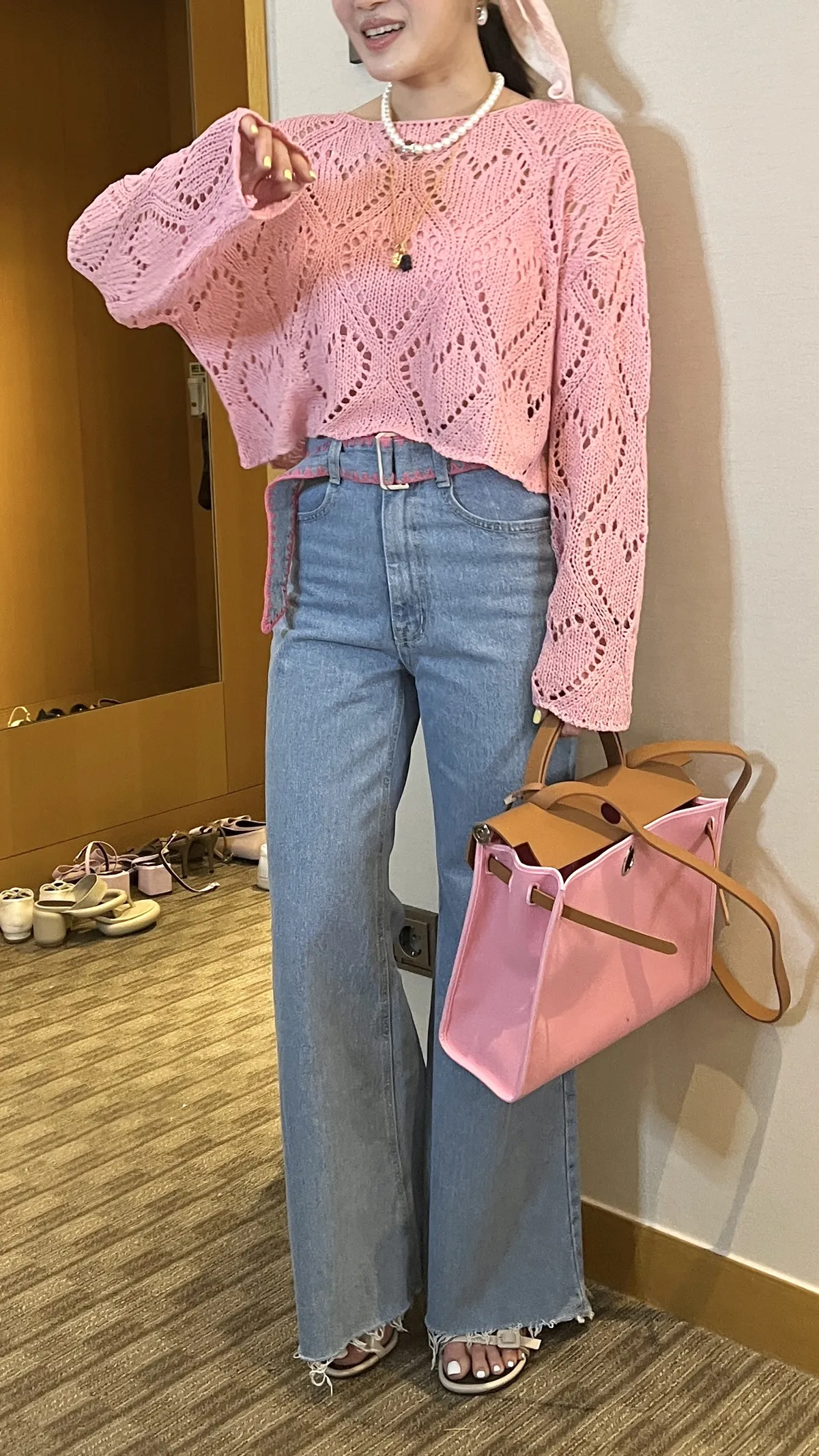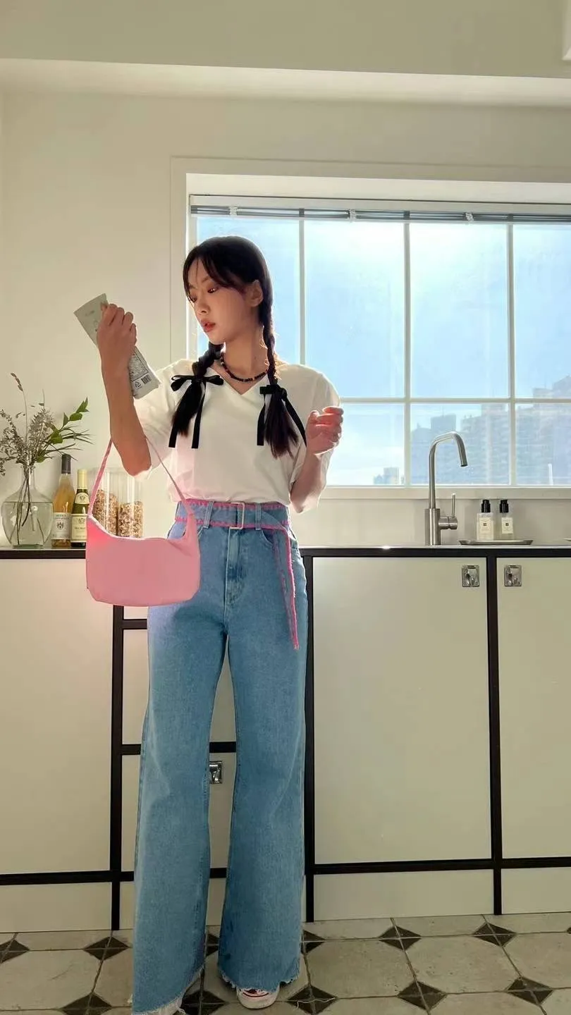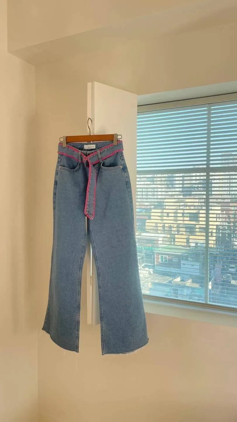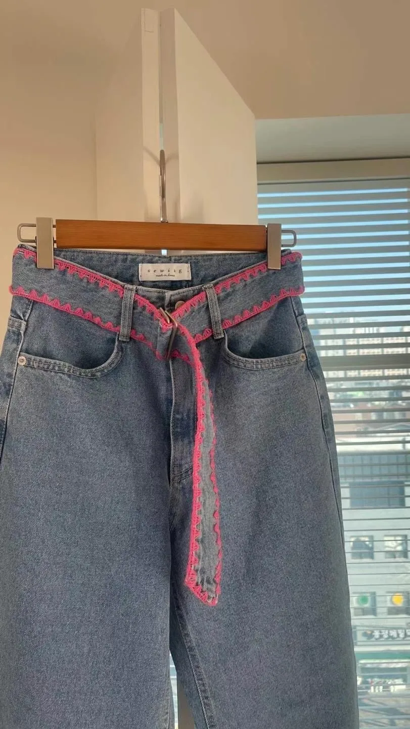 4778三角粉紅車線直筒顯瘦牛仔褲