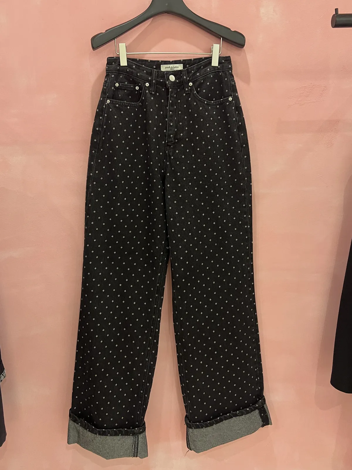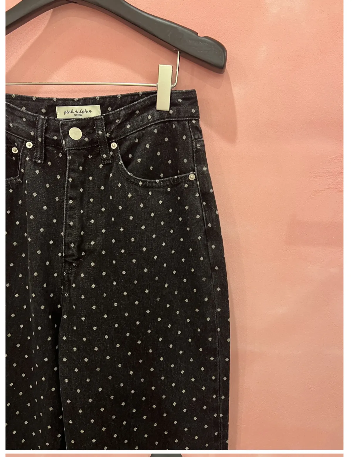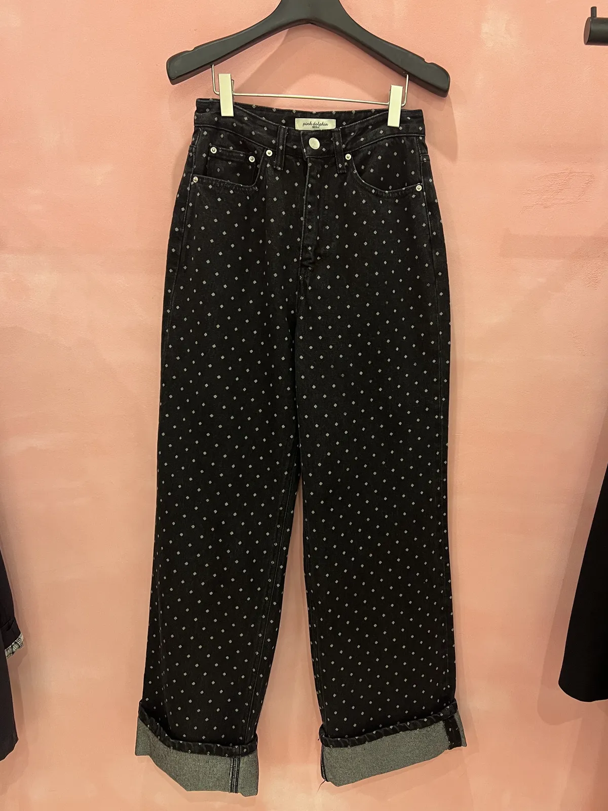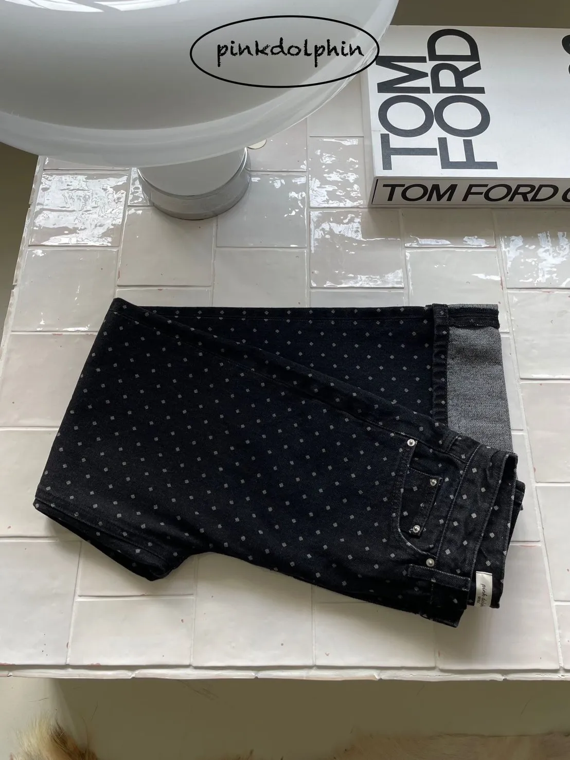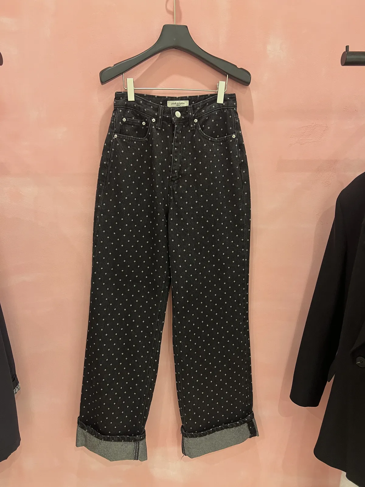 5287 (L號)小香風波點炭黑翻摺牛仔褲