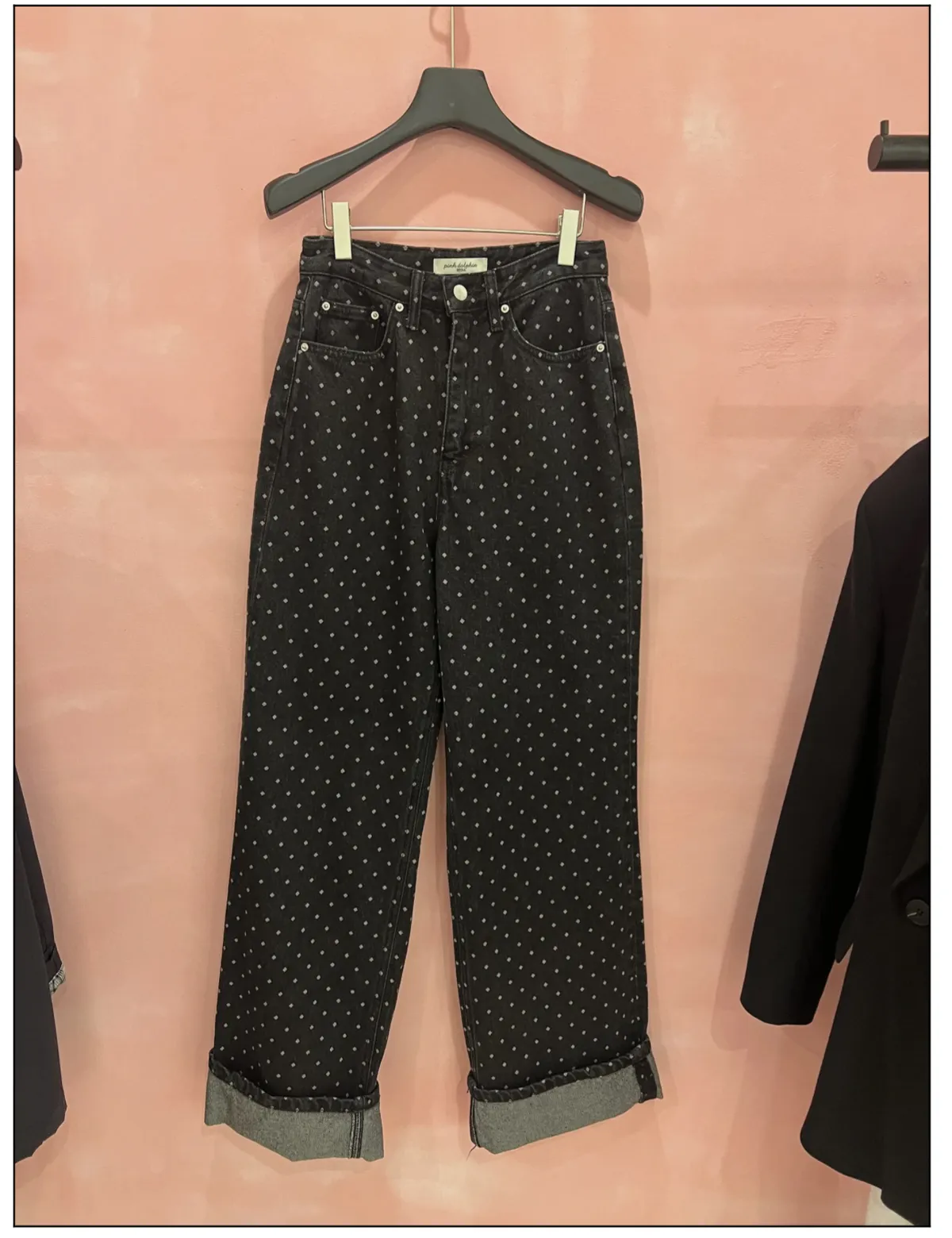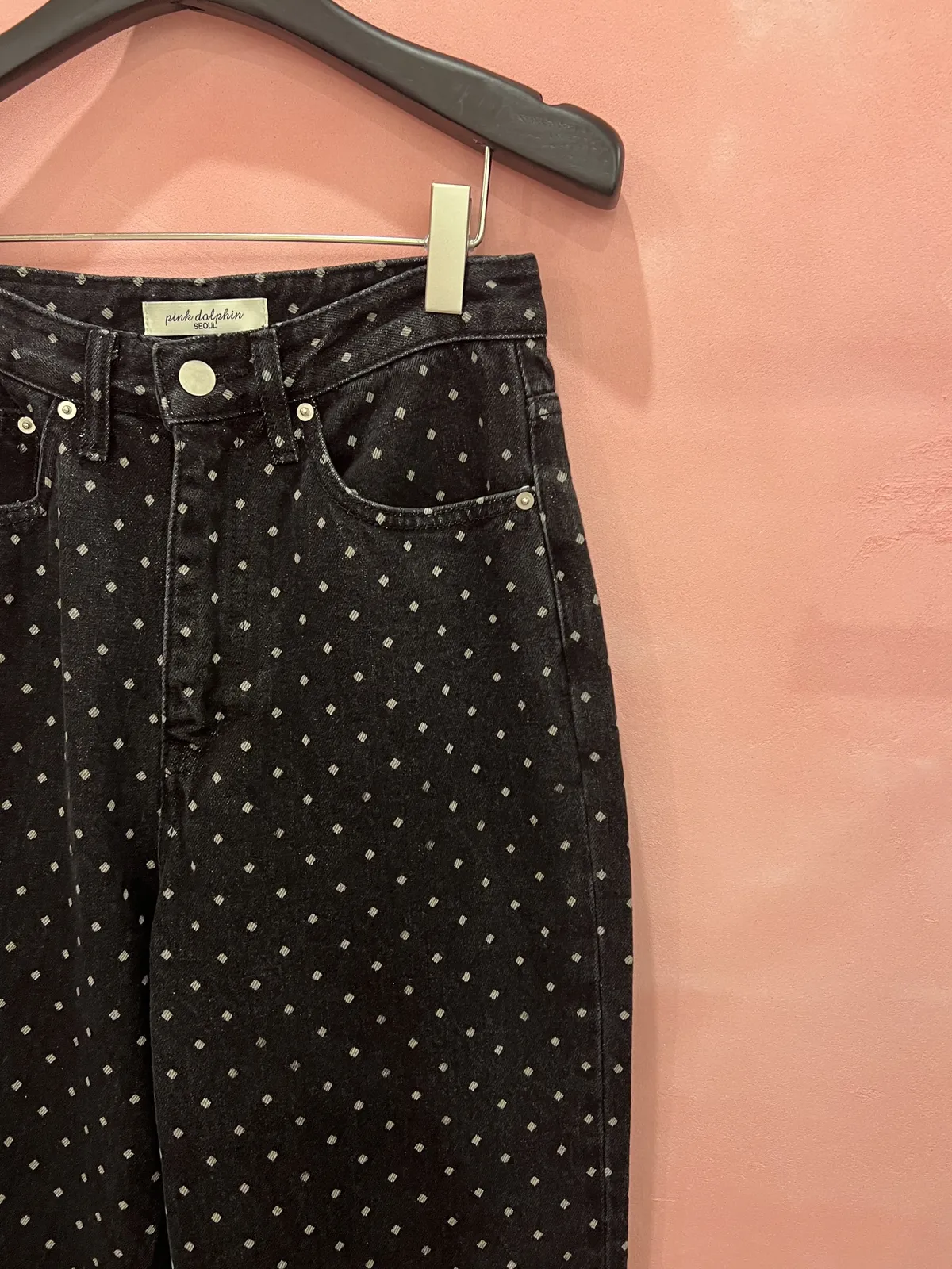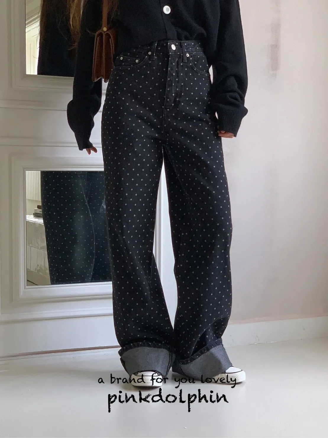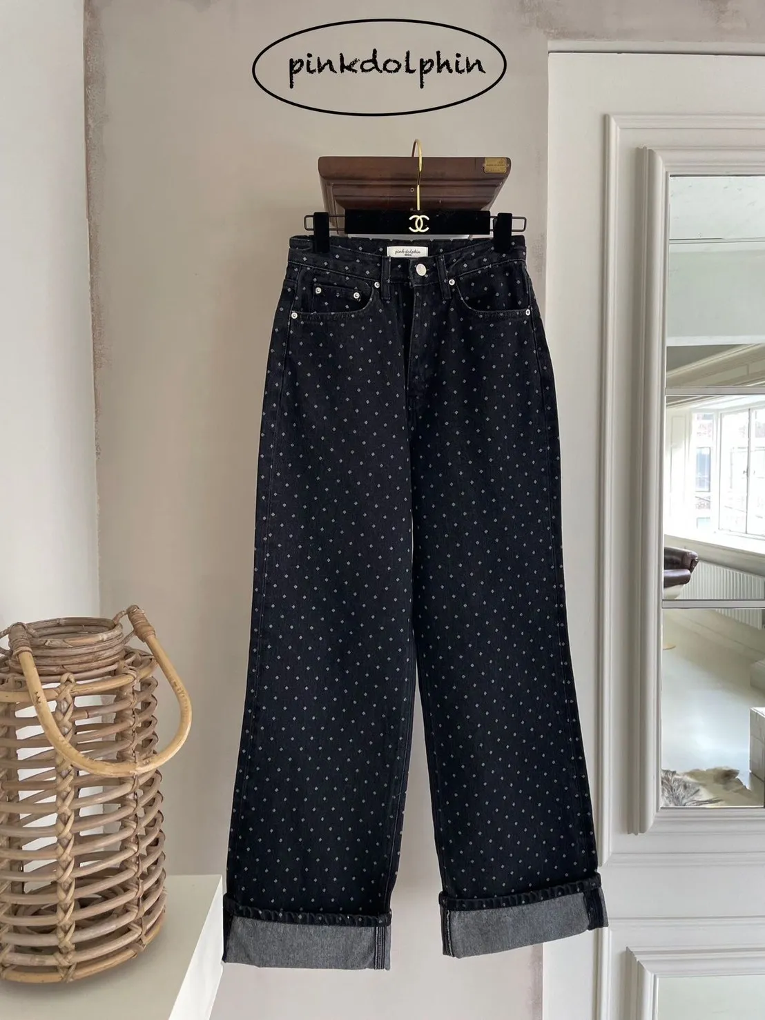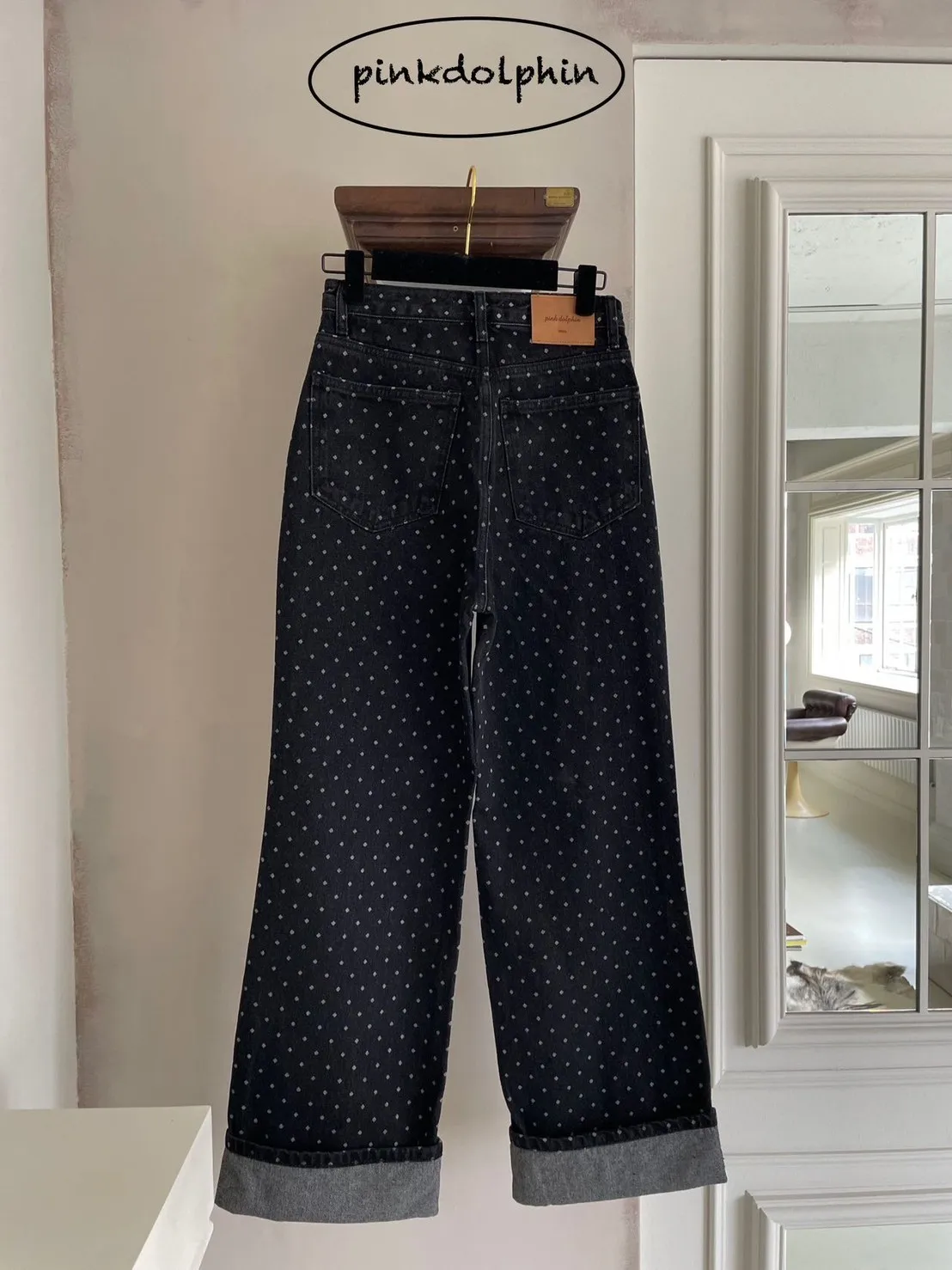 5287 (L號)小香風波點炭黑翻摺牛仔褲