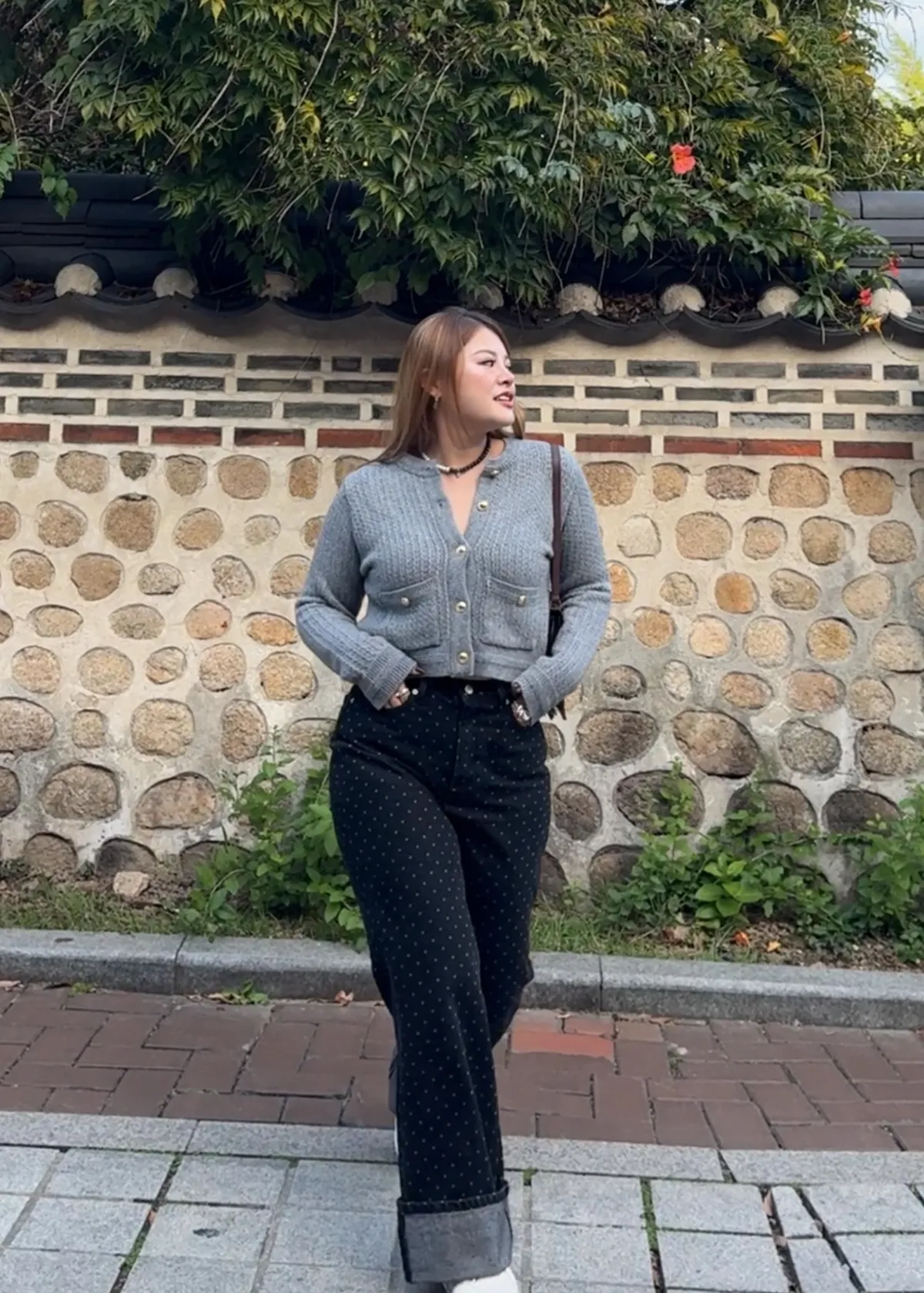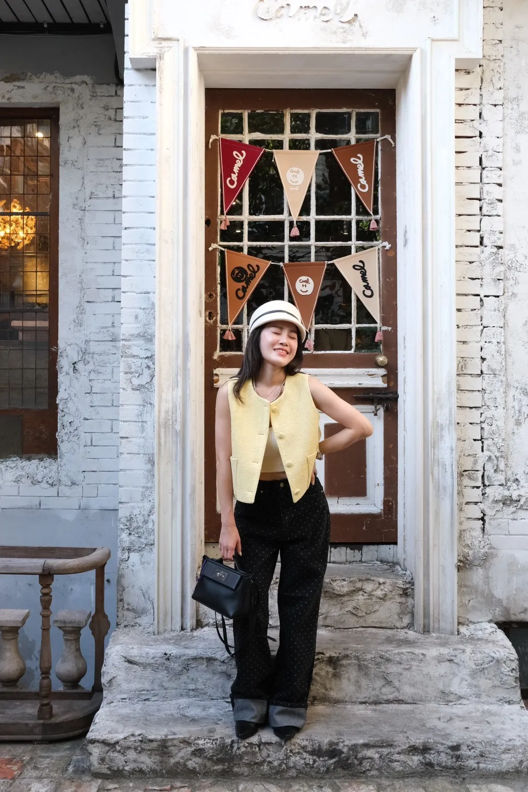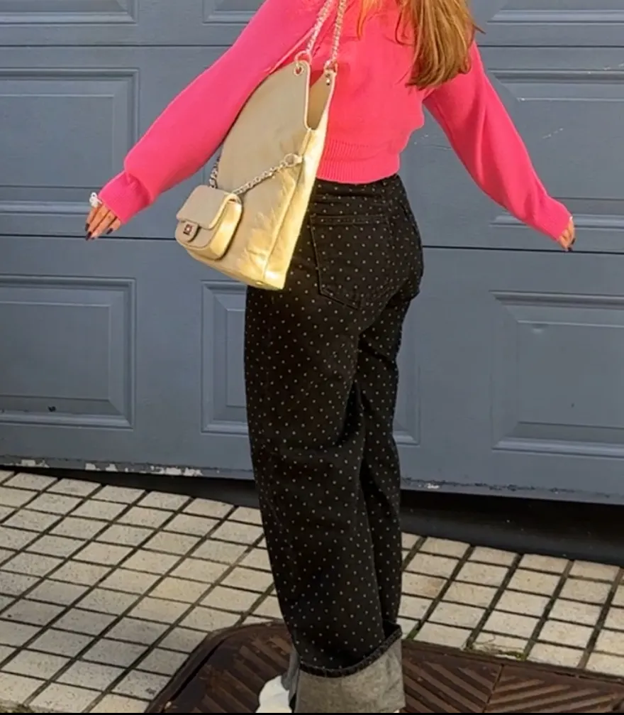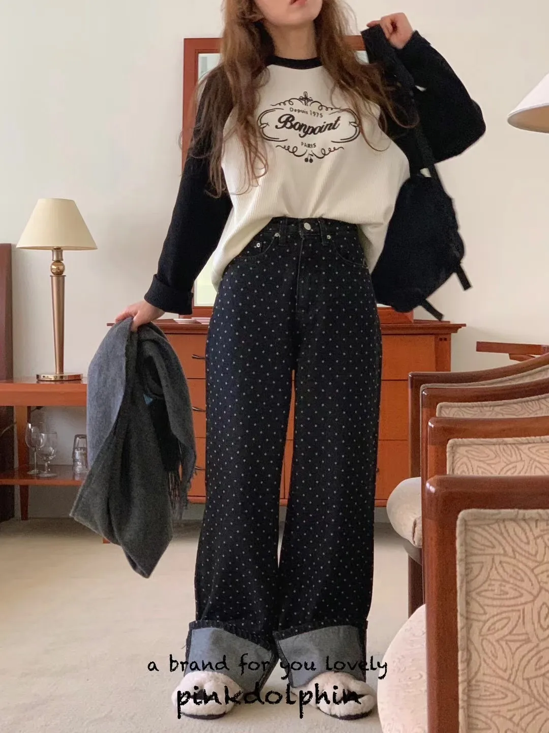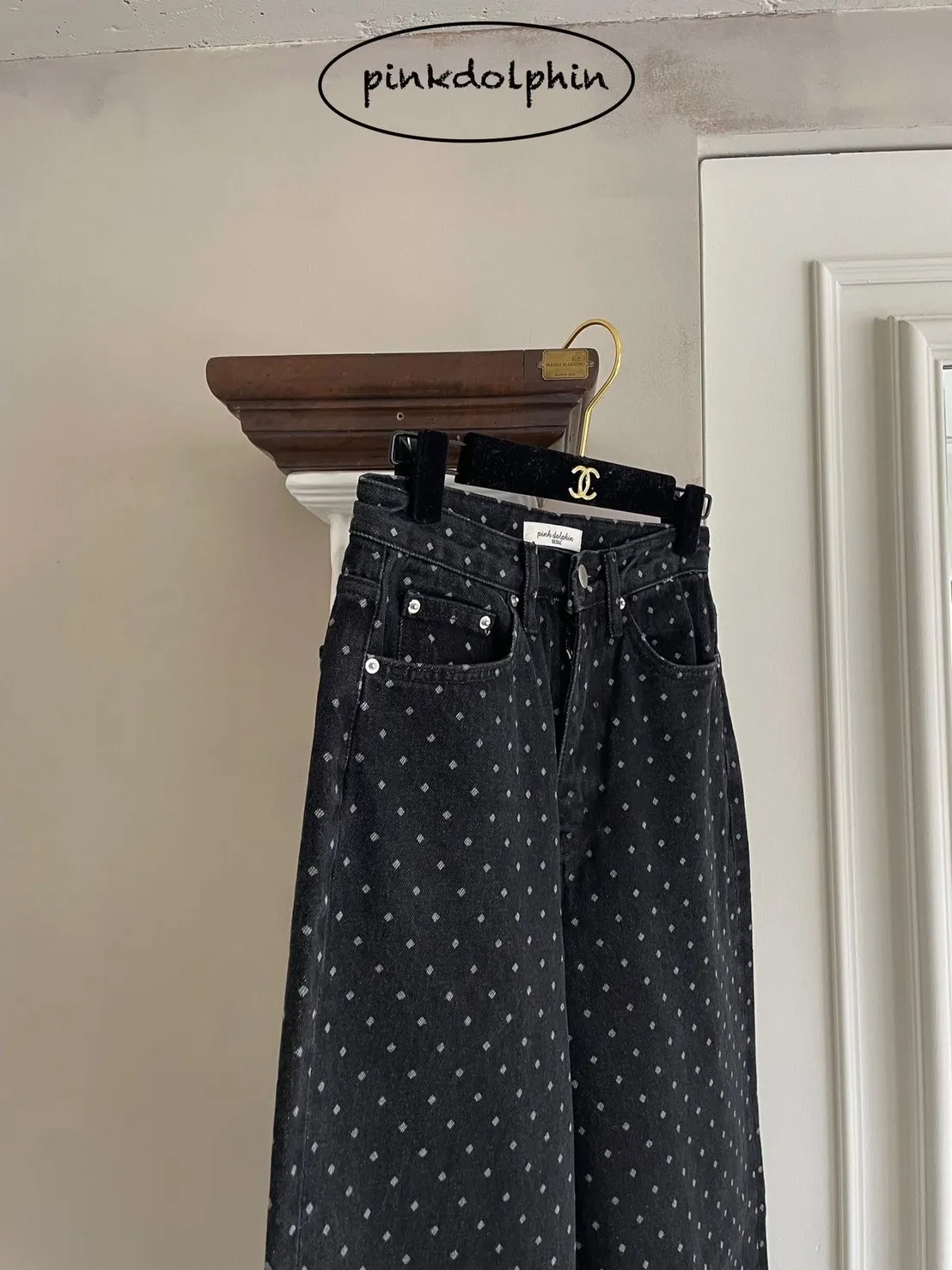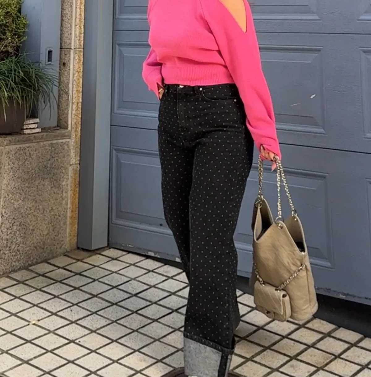 5287 (L號)小香風波點炭黑翻摺牛仔褲