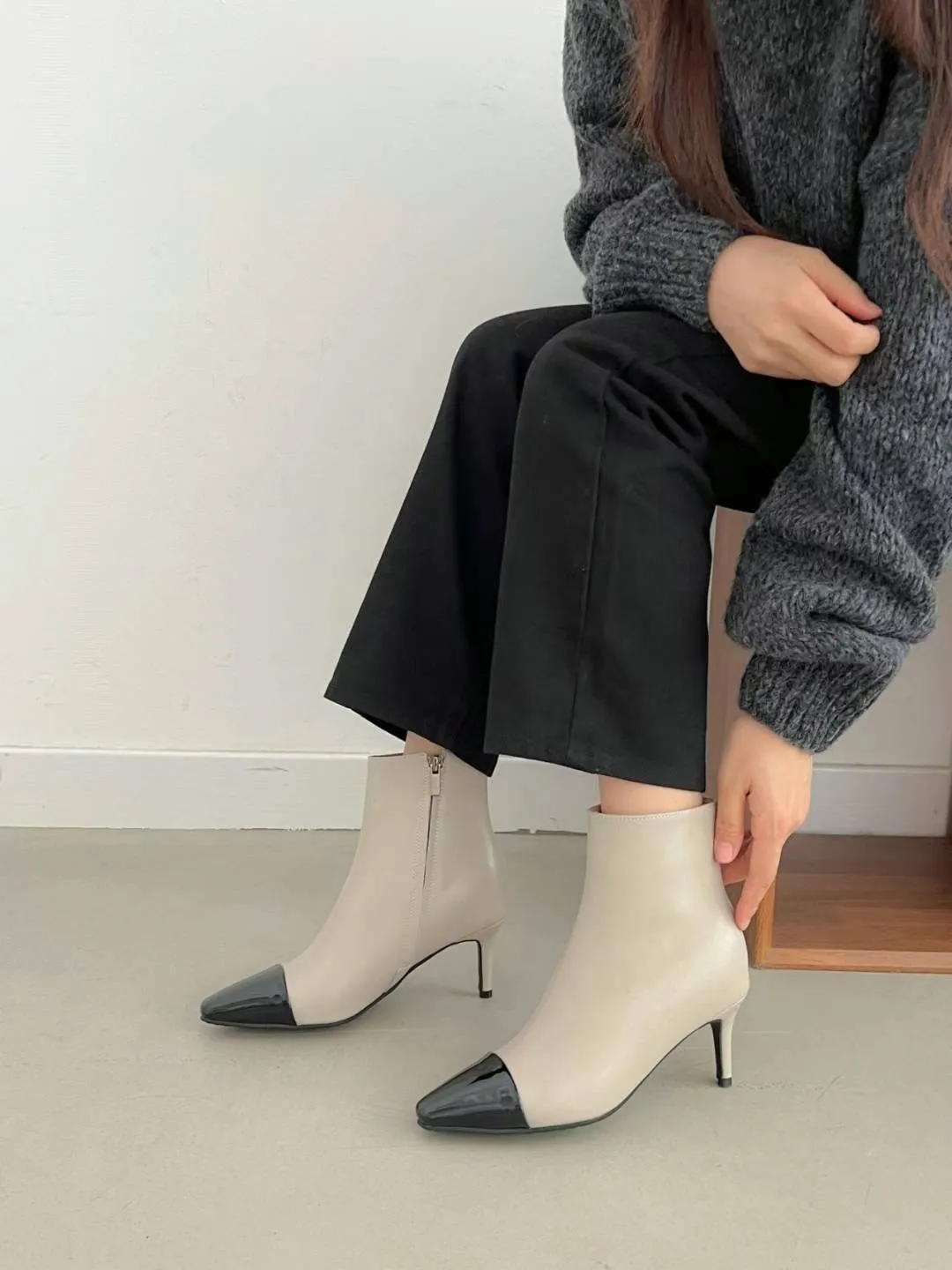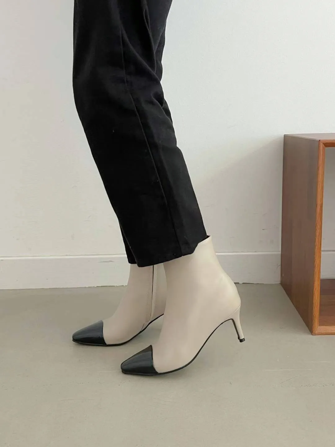 5466 牛皮尖頭雙色拼接踝靴