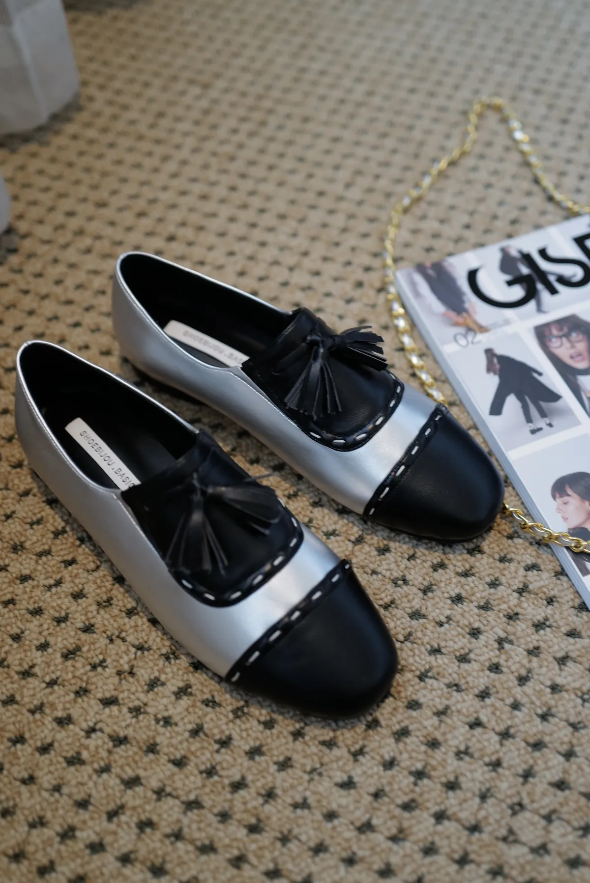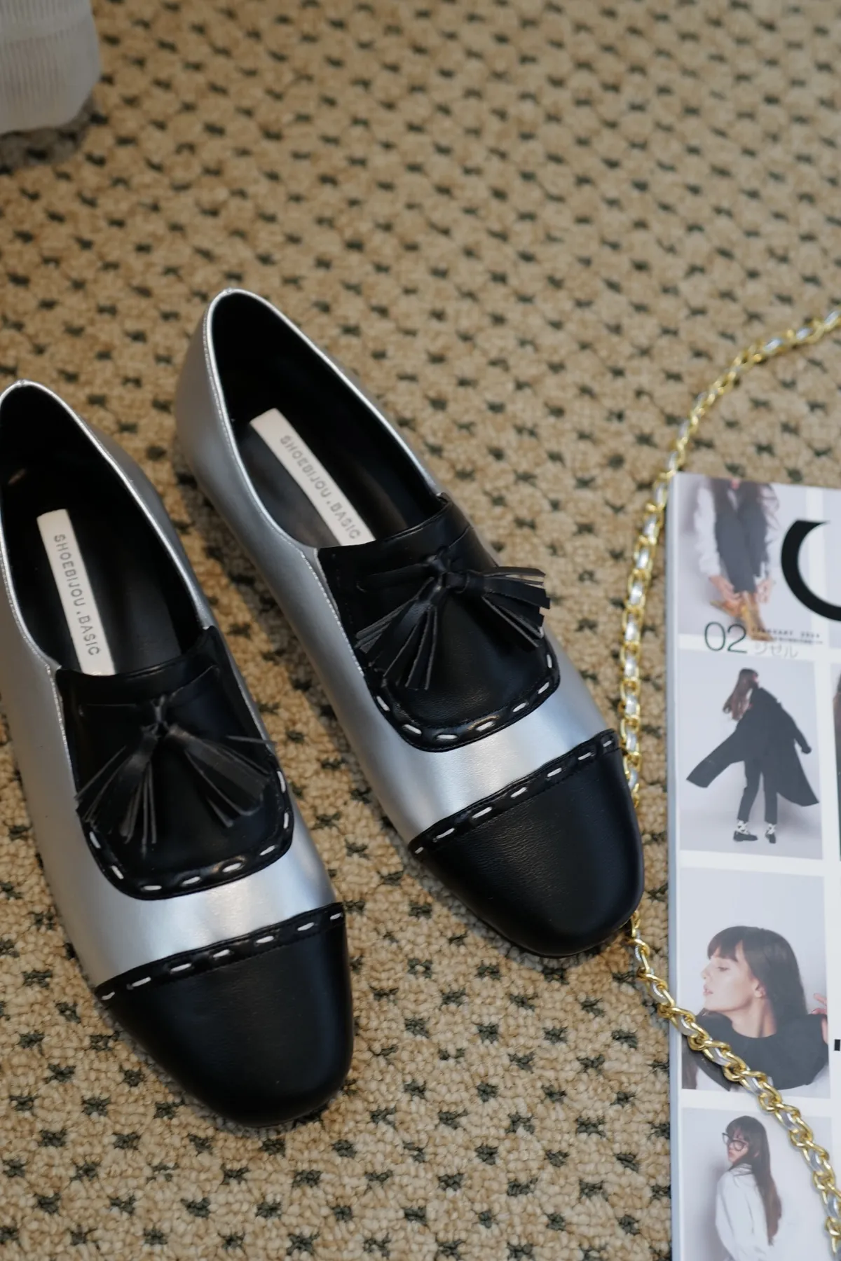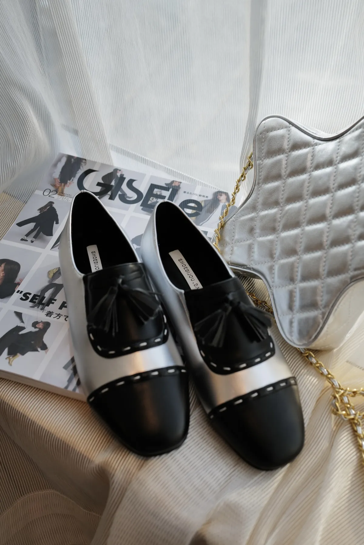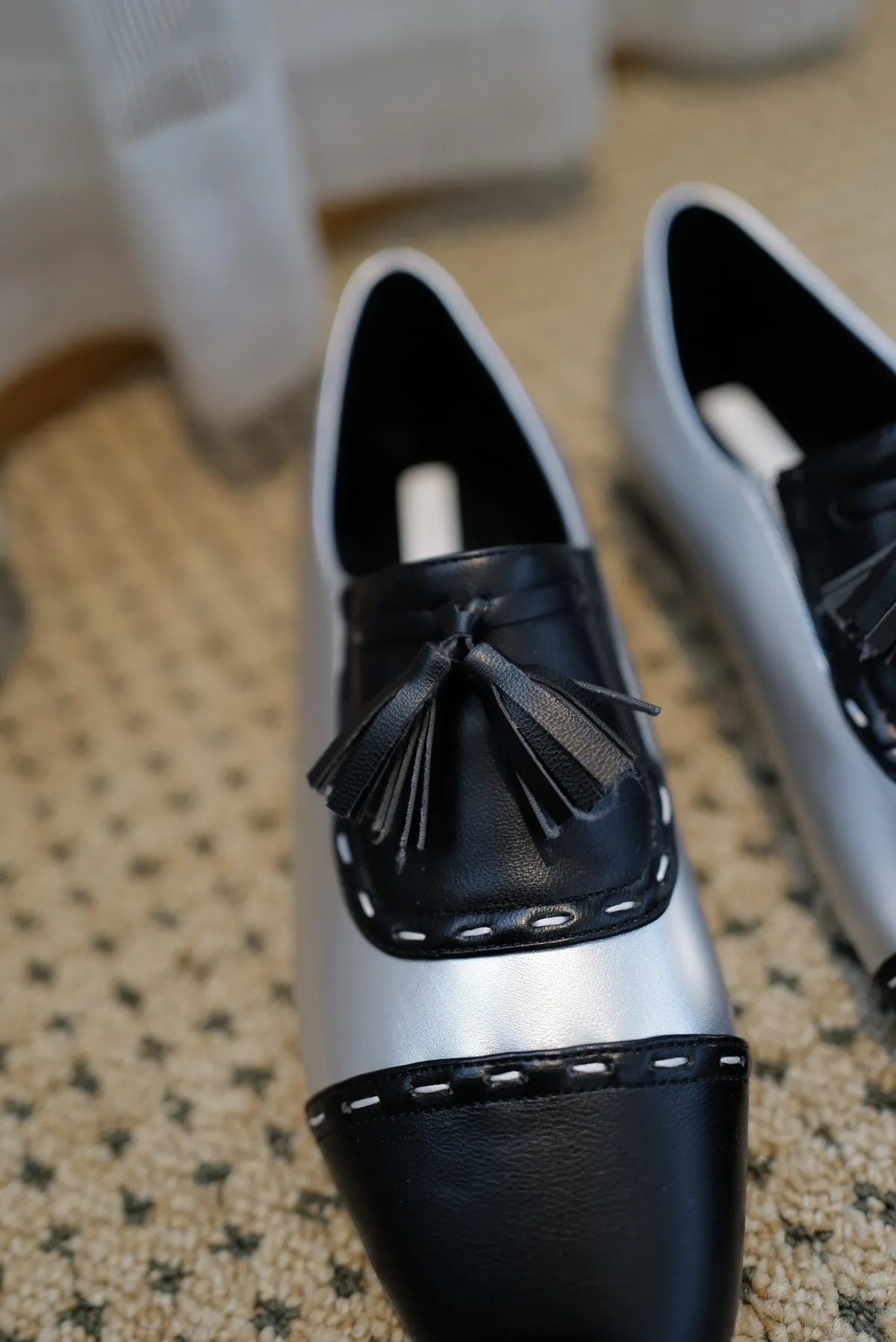 5975 霧銀拼色圓頭流蘇牛津鞋