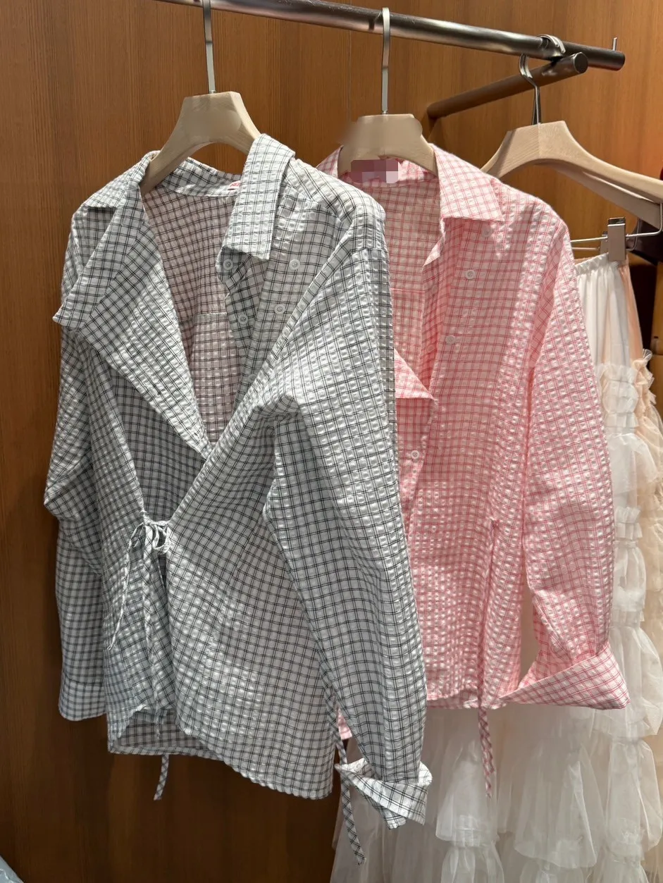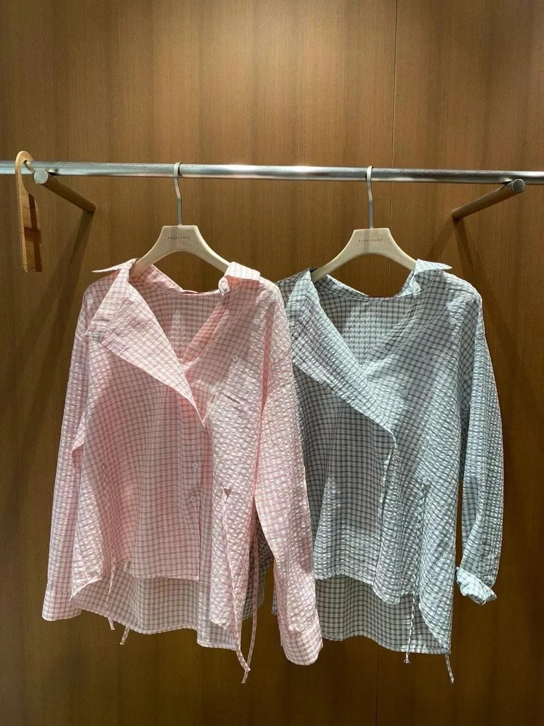 7900 鬆餅格紋設計綁帶可愛襯衫