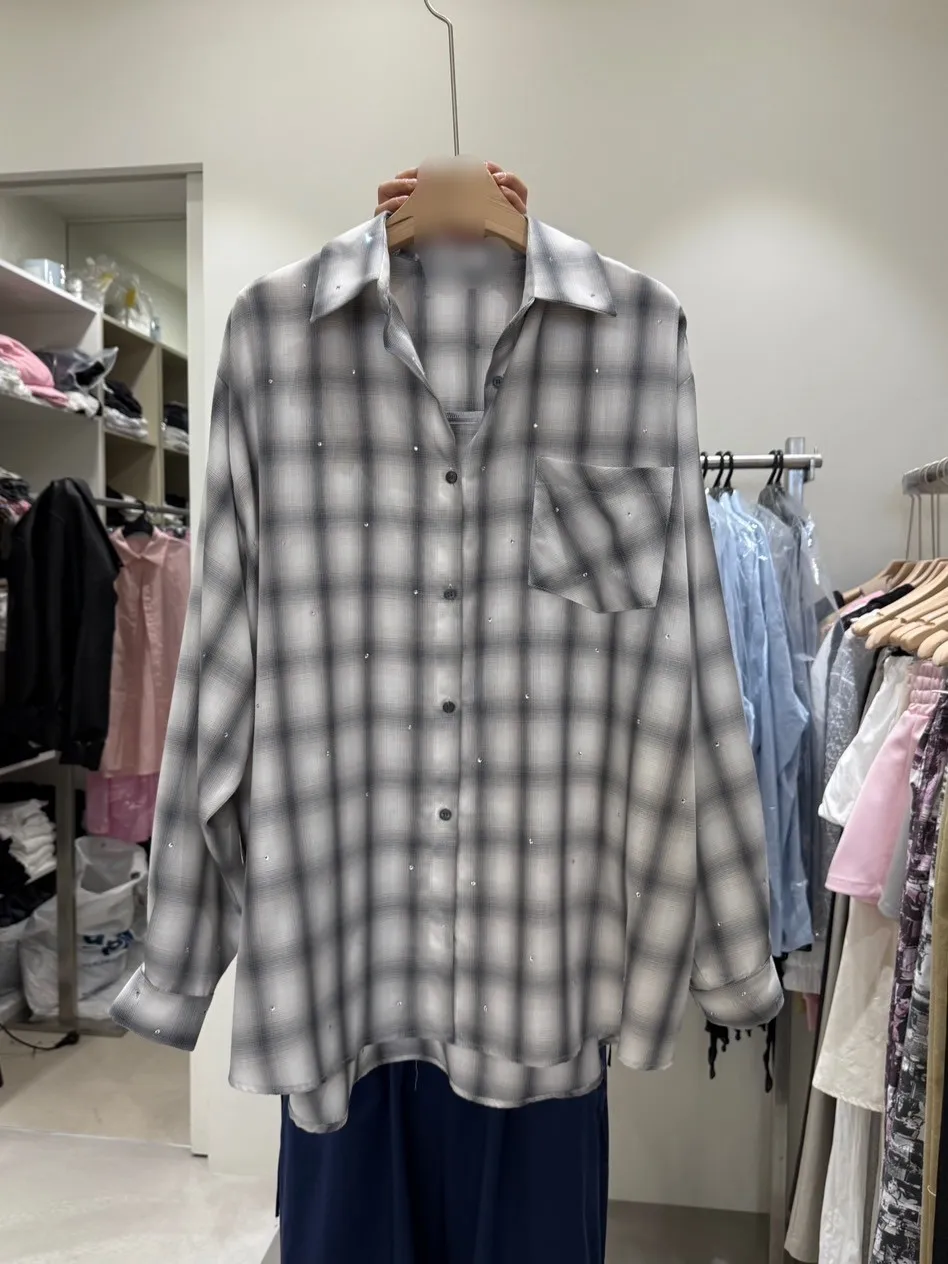 8346 霧灰格子滿鑽軟料襯衫