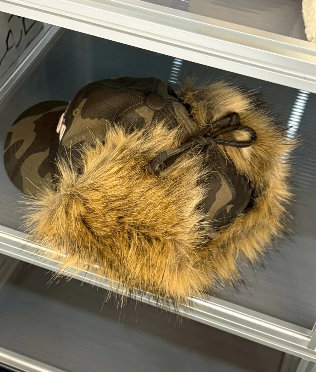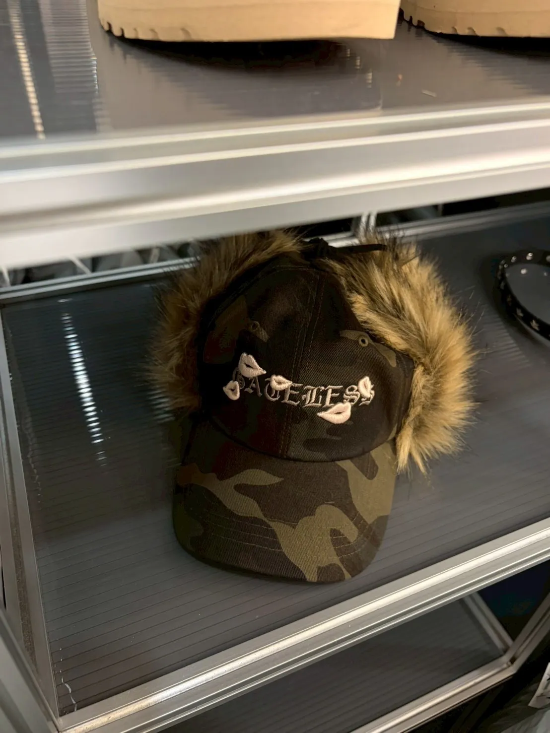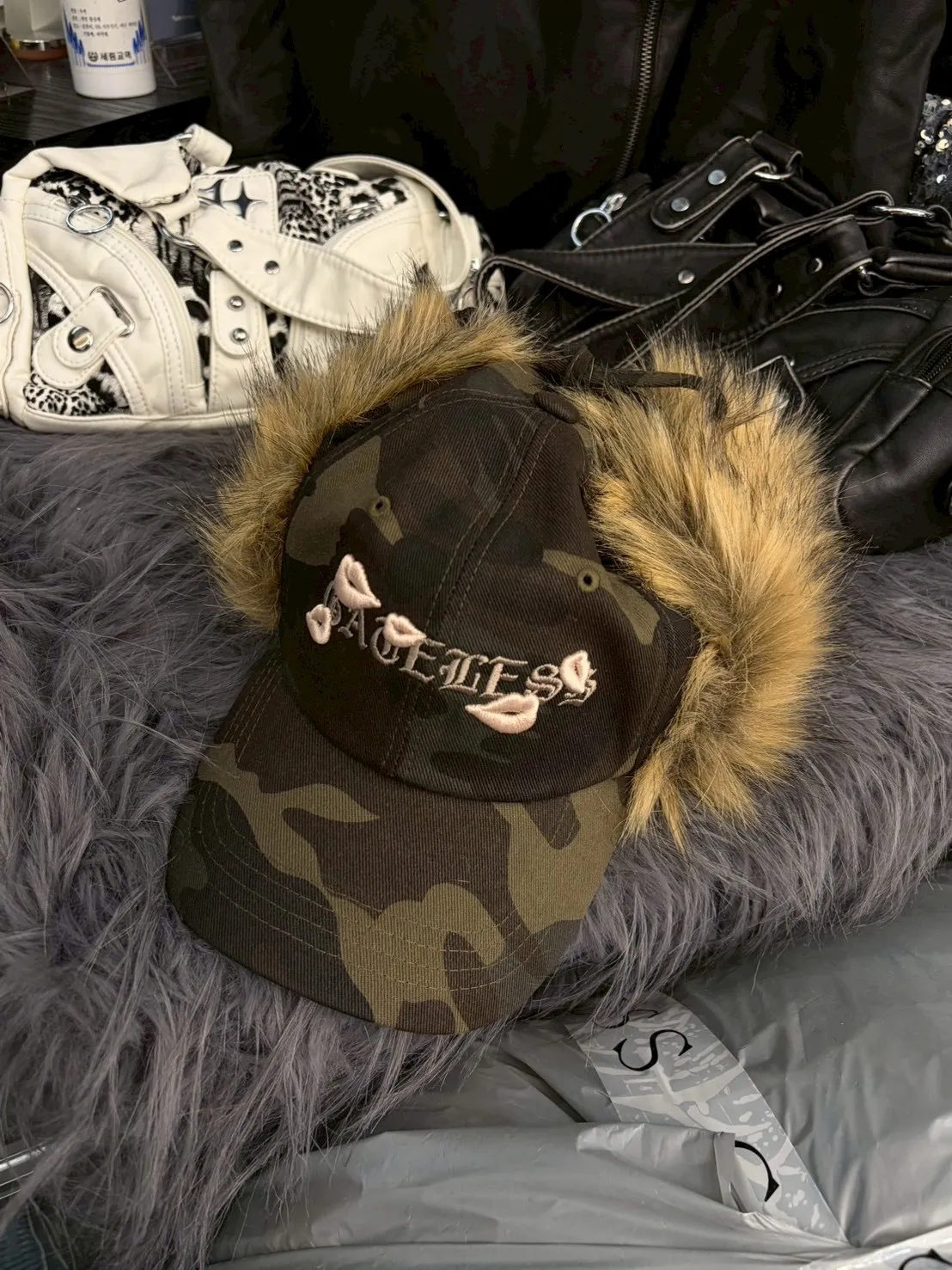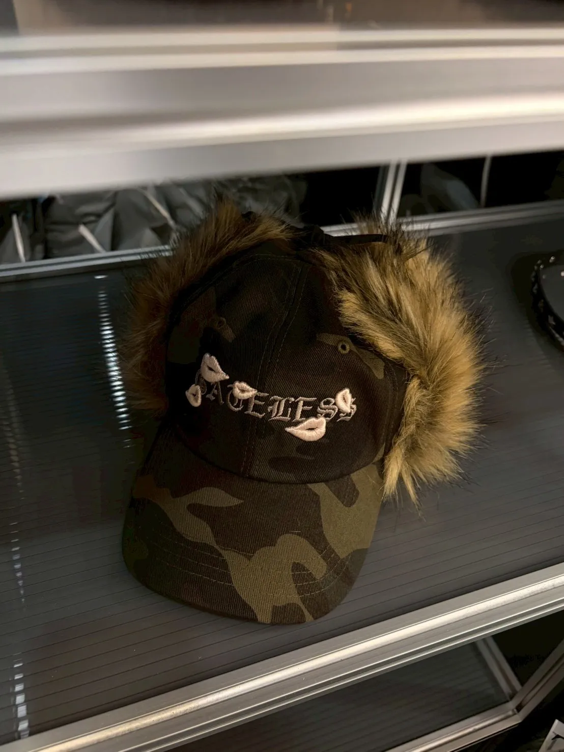 A12019 店家設計刺繡嘴唇迷彩耳蓋毛毛帽