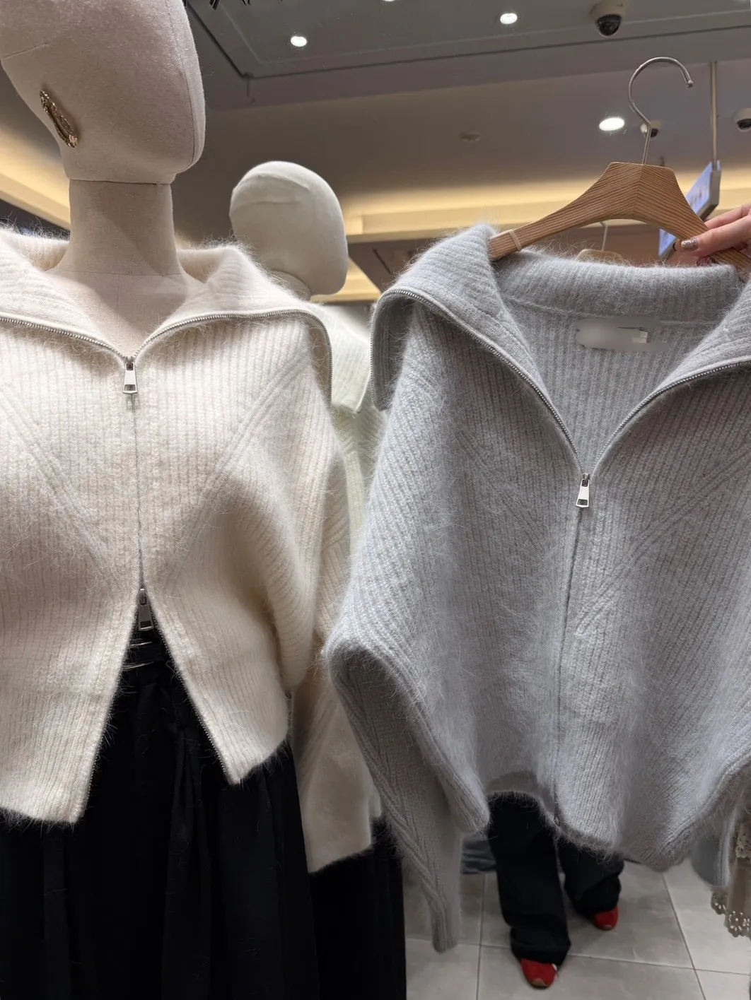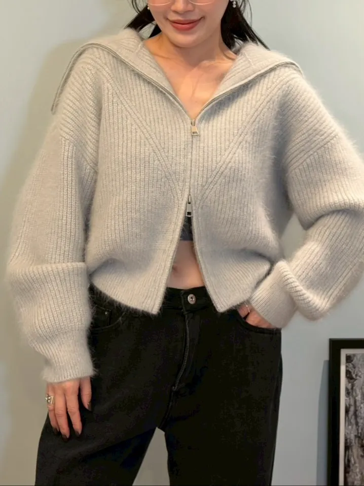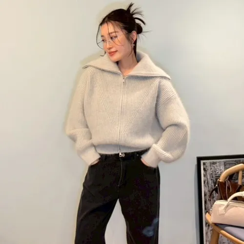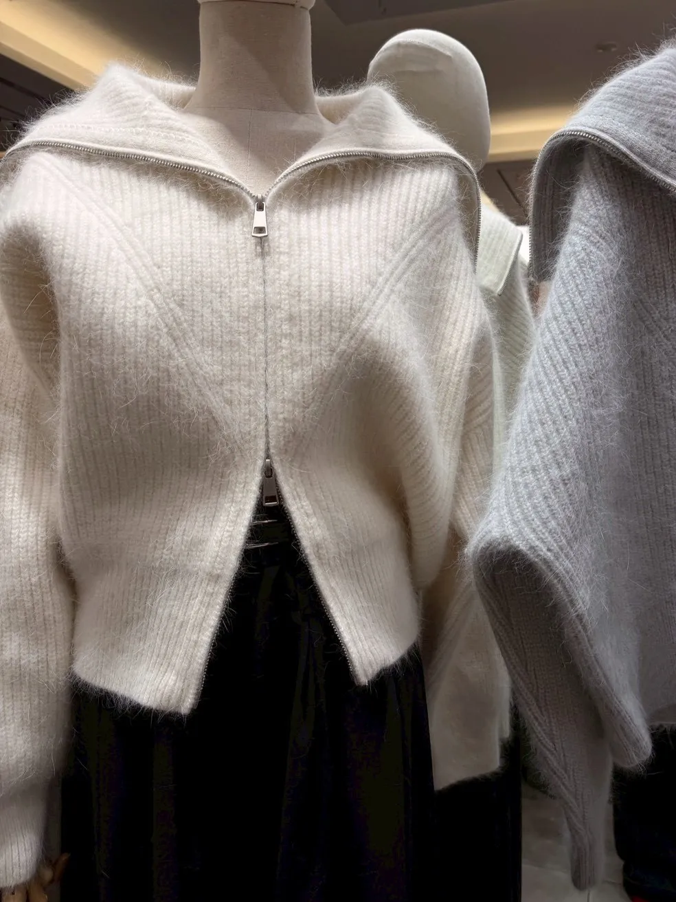 A12041 浣熊毛雙拉鏈翻領毛衣外套