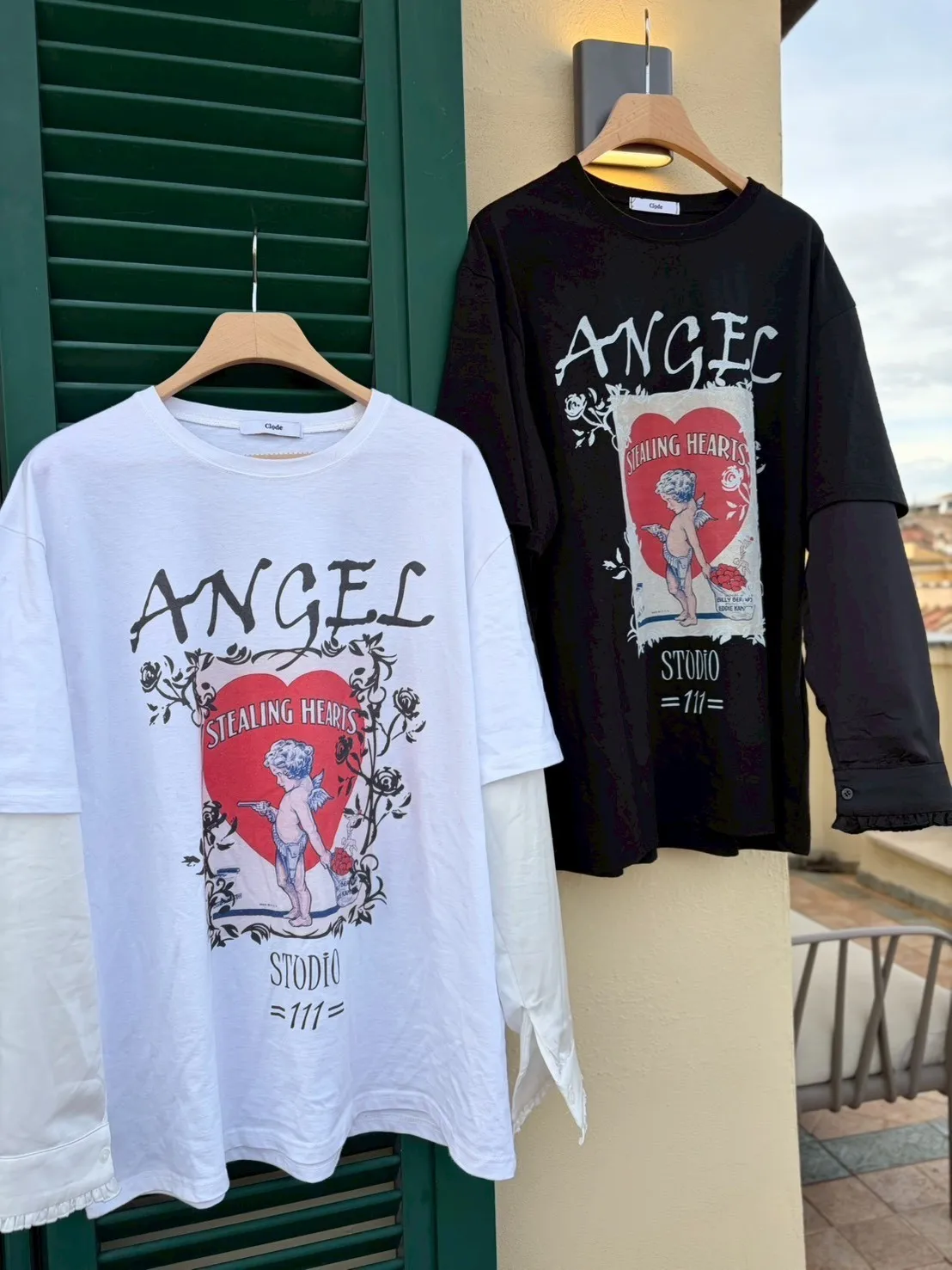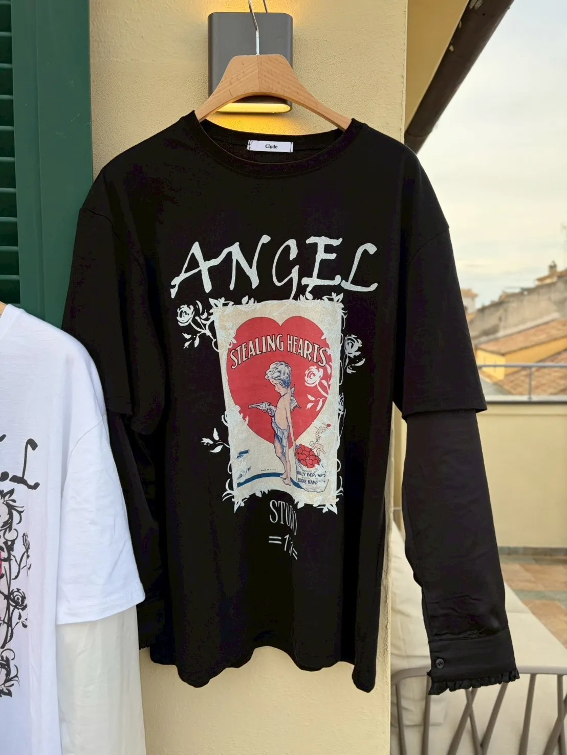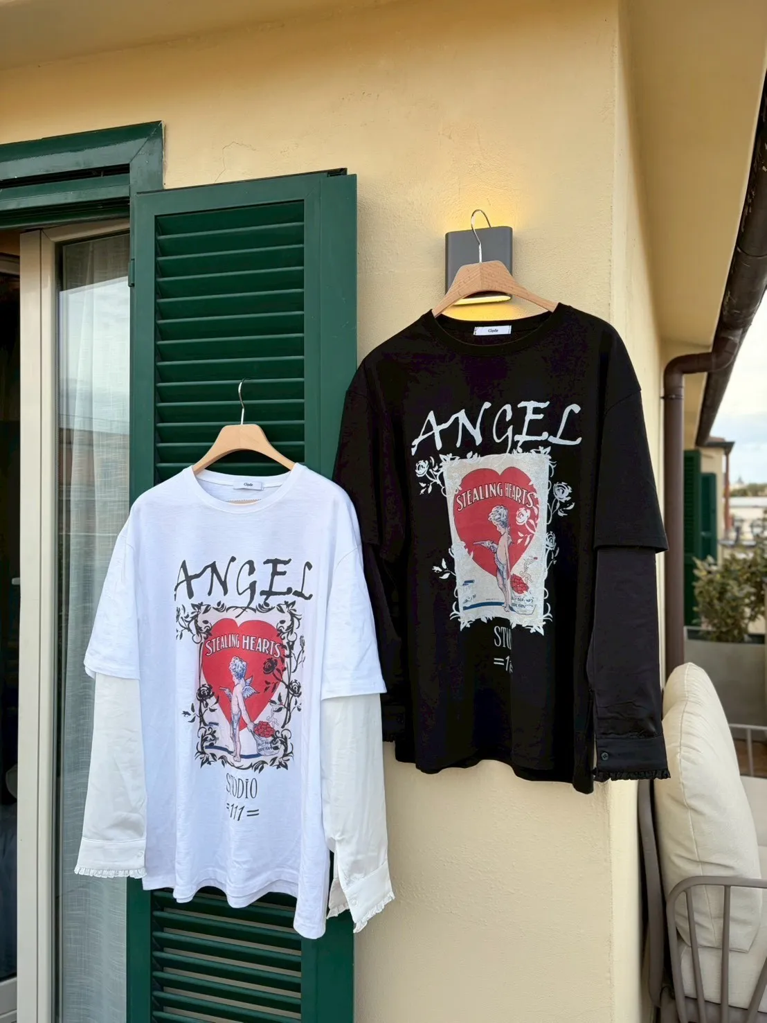 A12069 自訂現貨 小天使拼襯衫袖棉質長T上衣