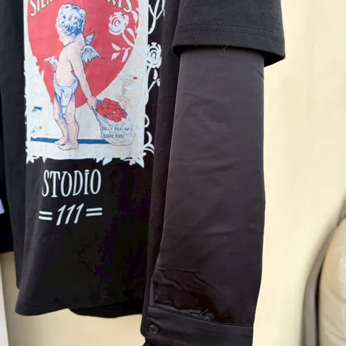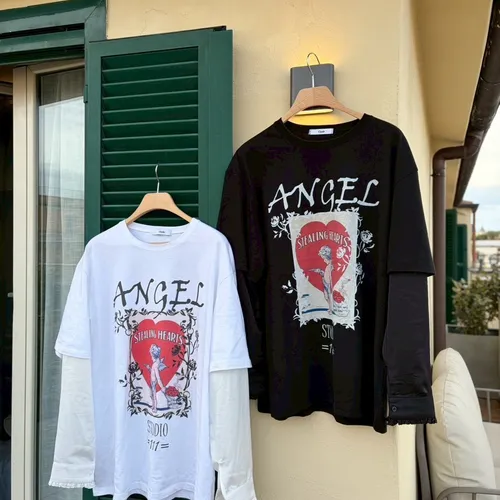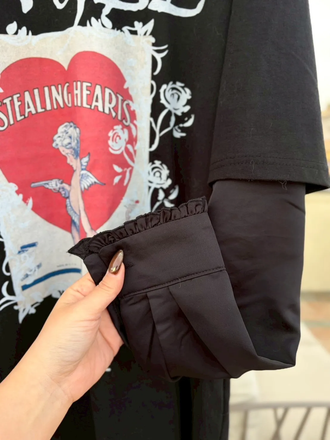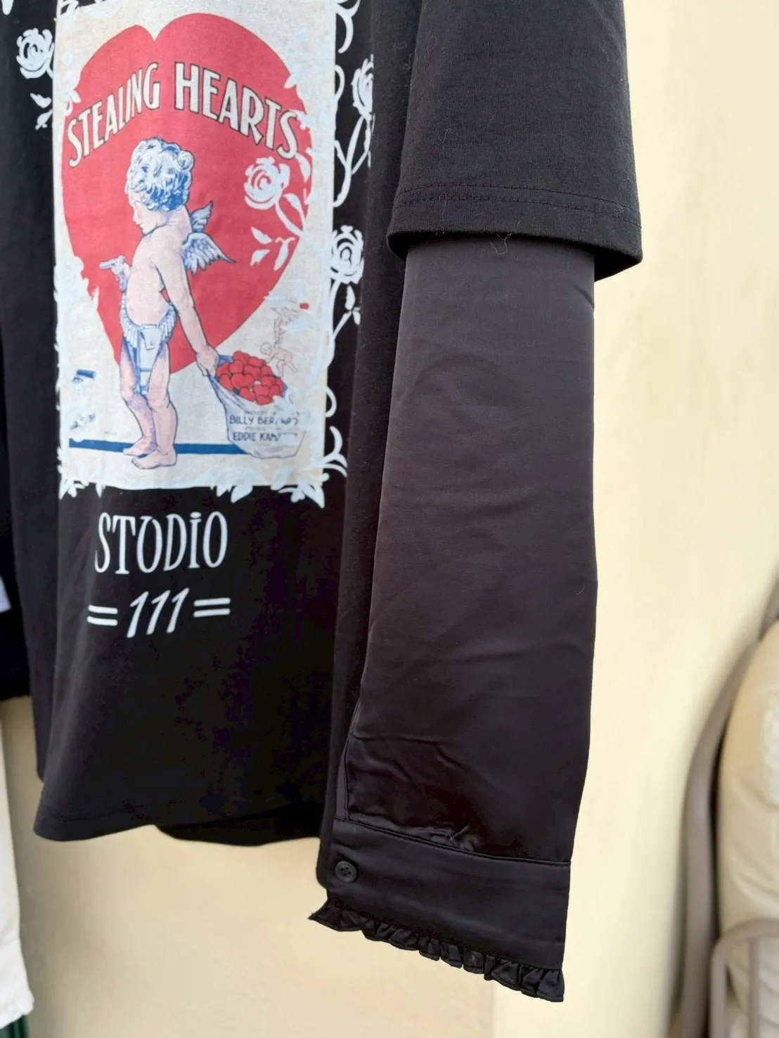 A12069 自訂現貨 小天使拼襯衫袖棉質長T上衣