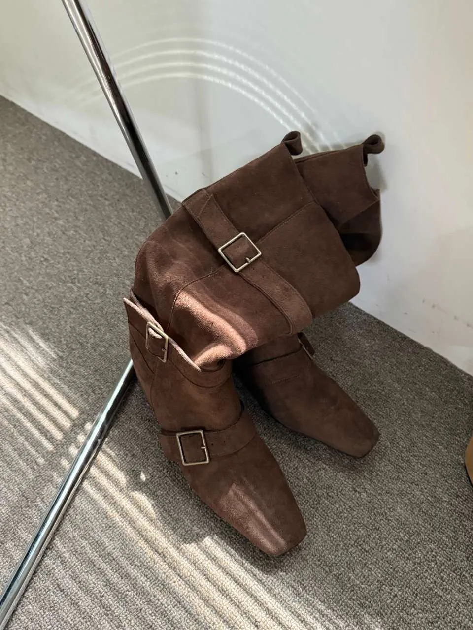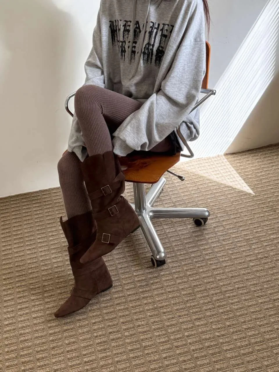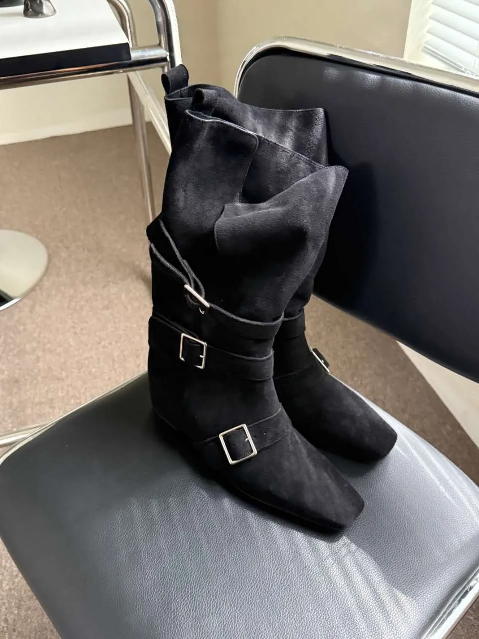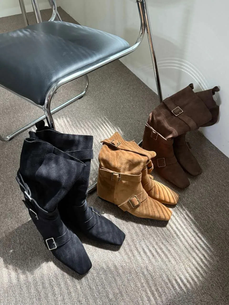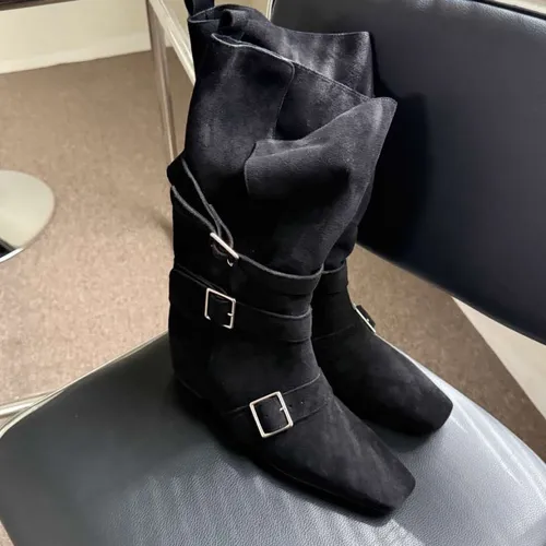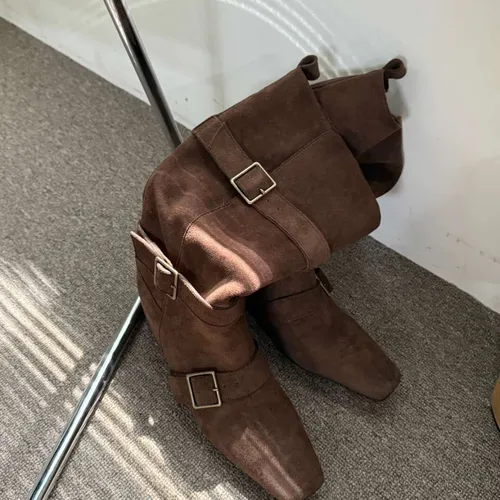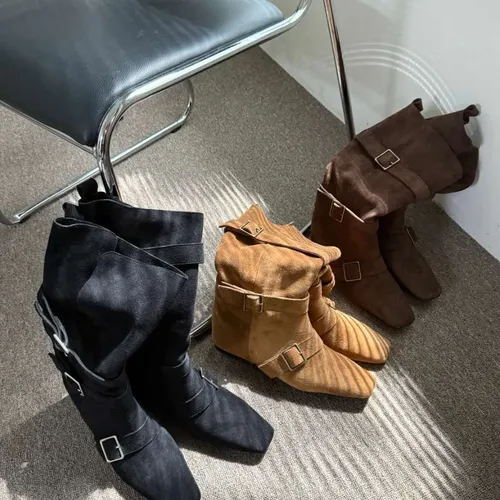 A9063 霧感方頭扣帶隱藏坡跟翻摺靴