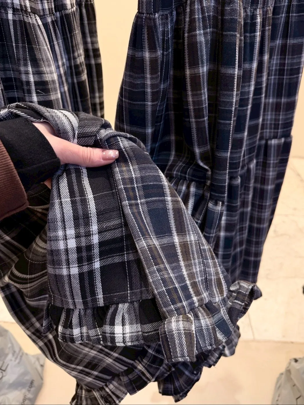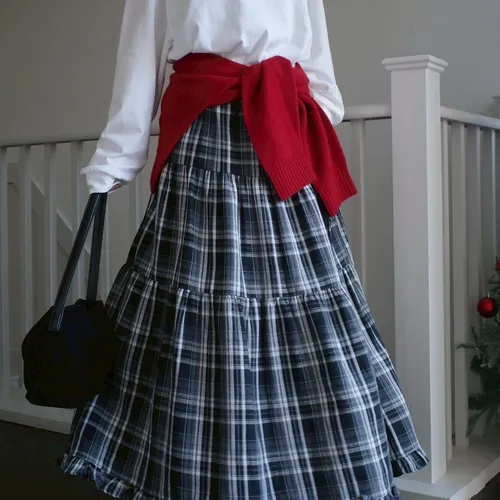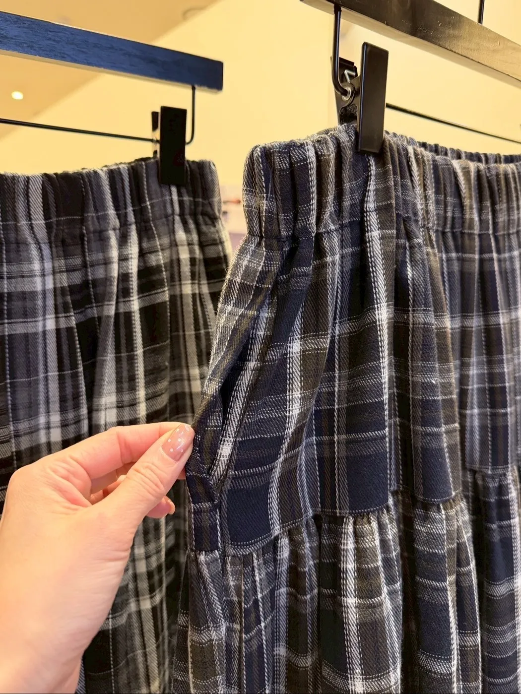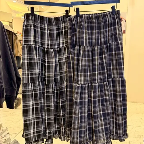 B1040 格紋波浪滾邊口袋彈性長裙