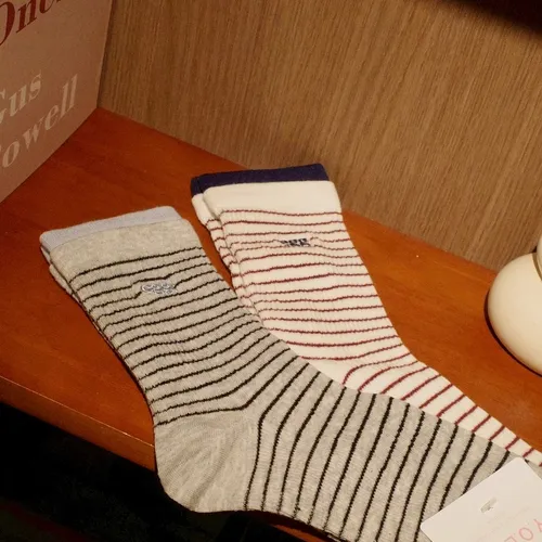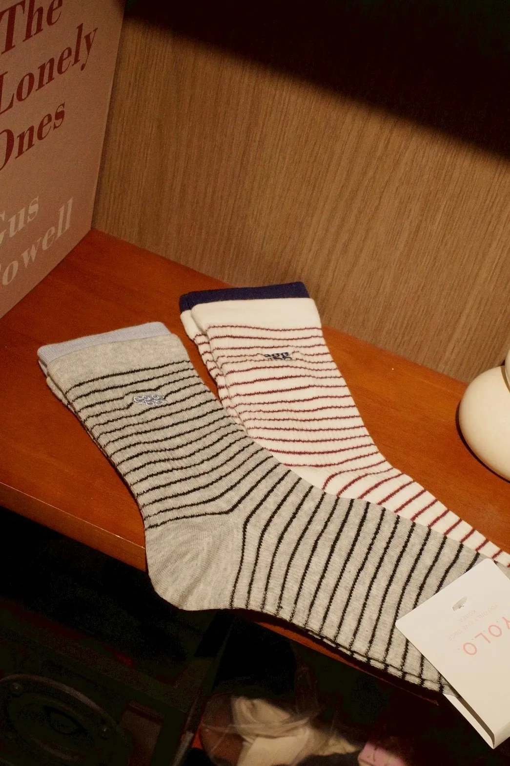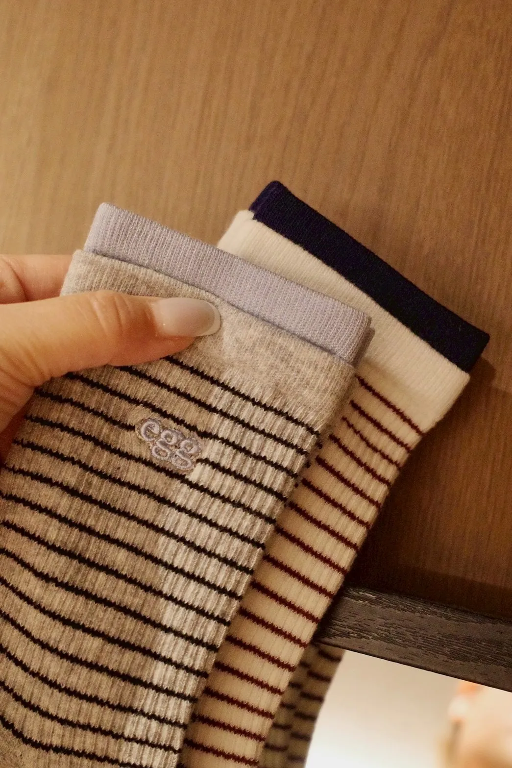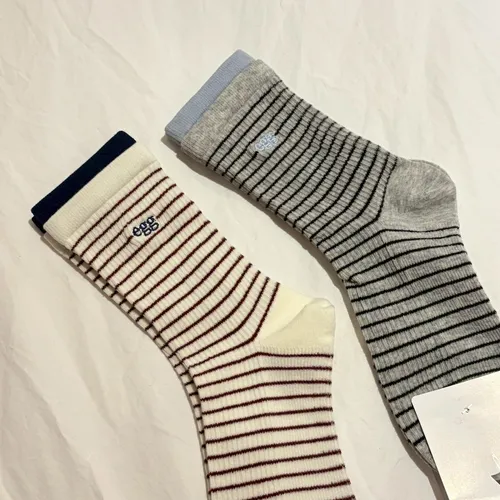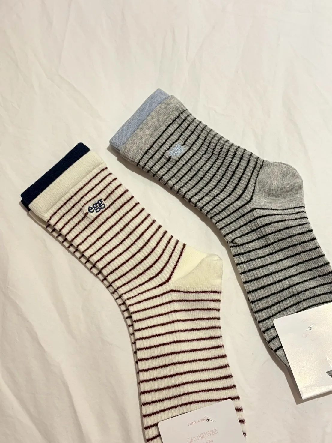 B1069 刺繡條紋雙層拼色襪 兩色一組