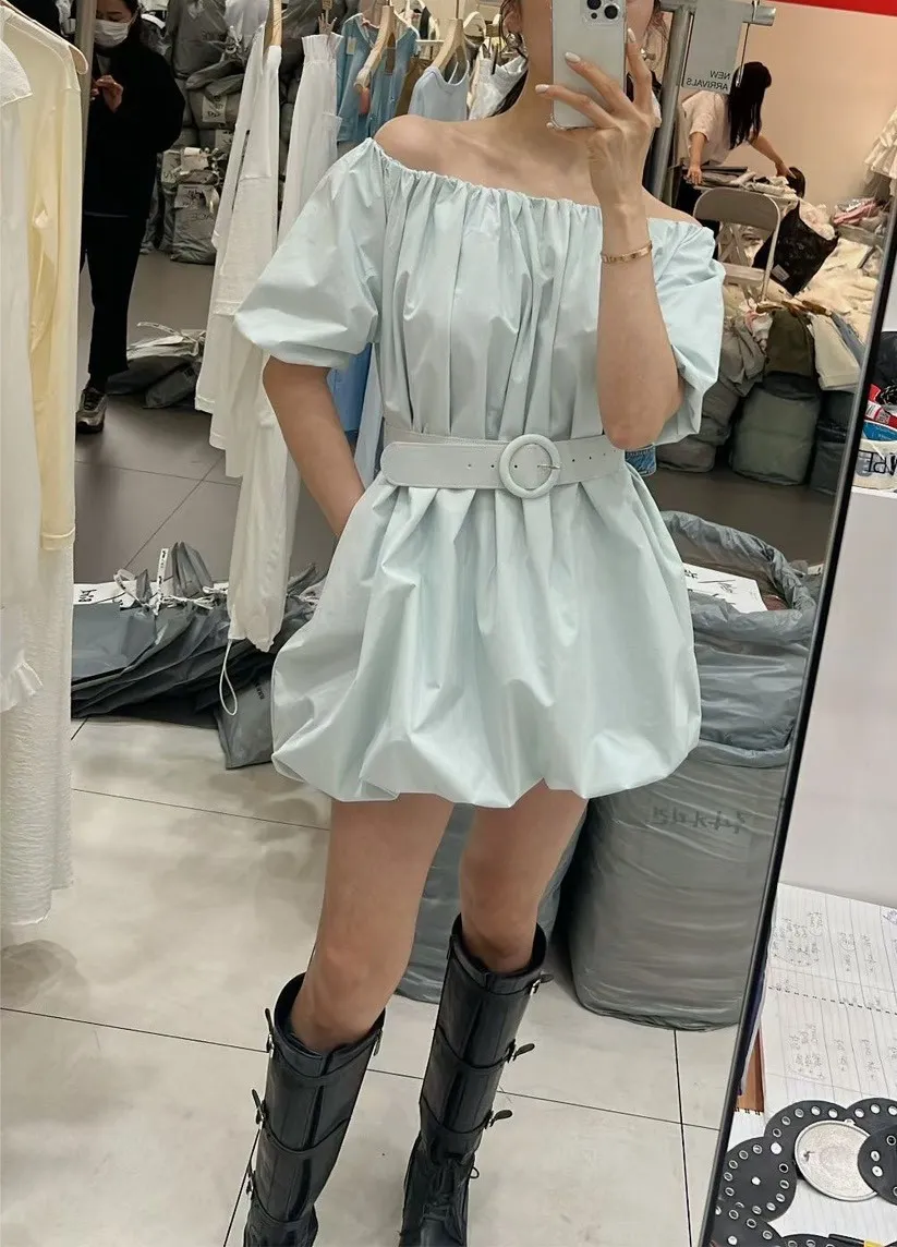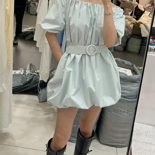 B3132 甜美平肩口袋澎澎洋裝 附腰帶