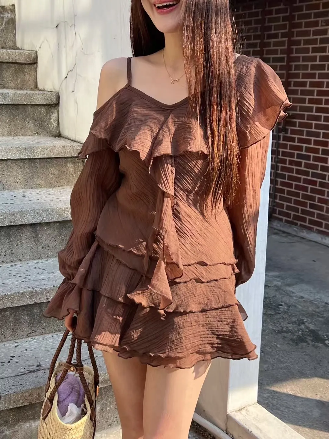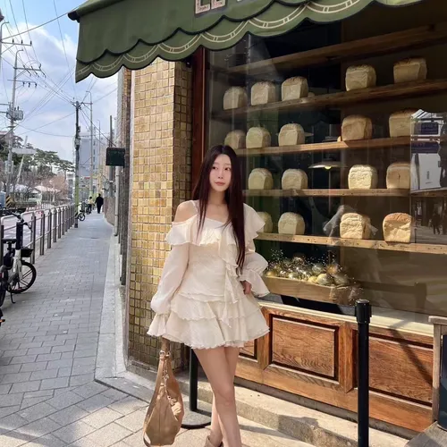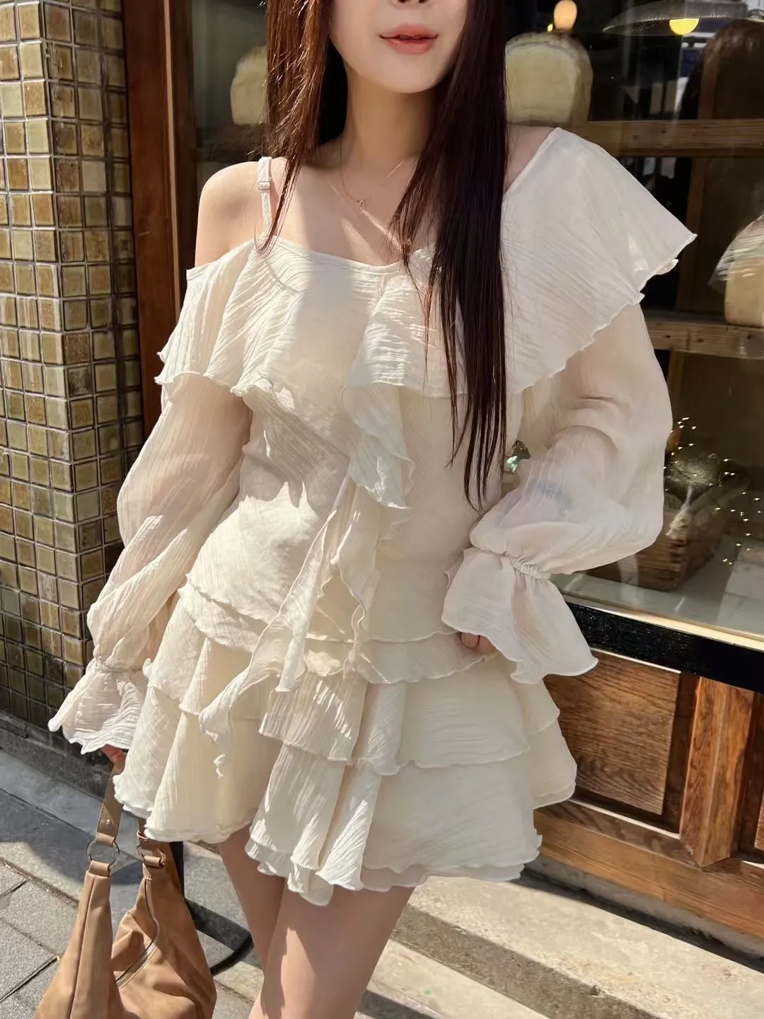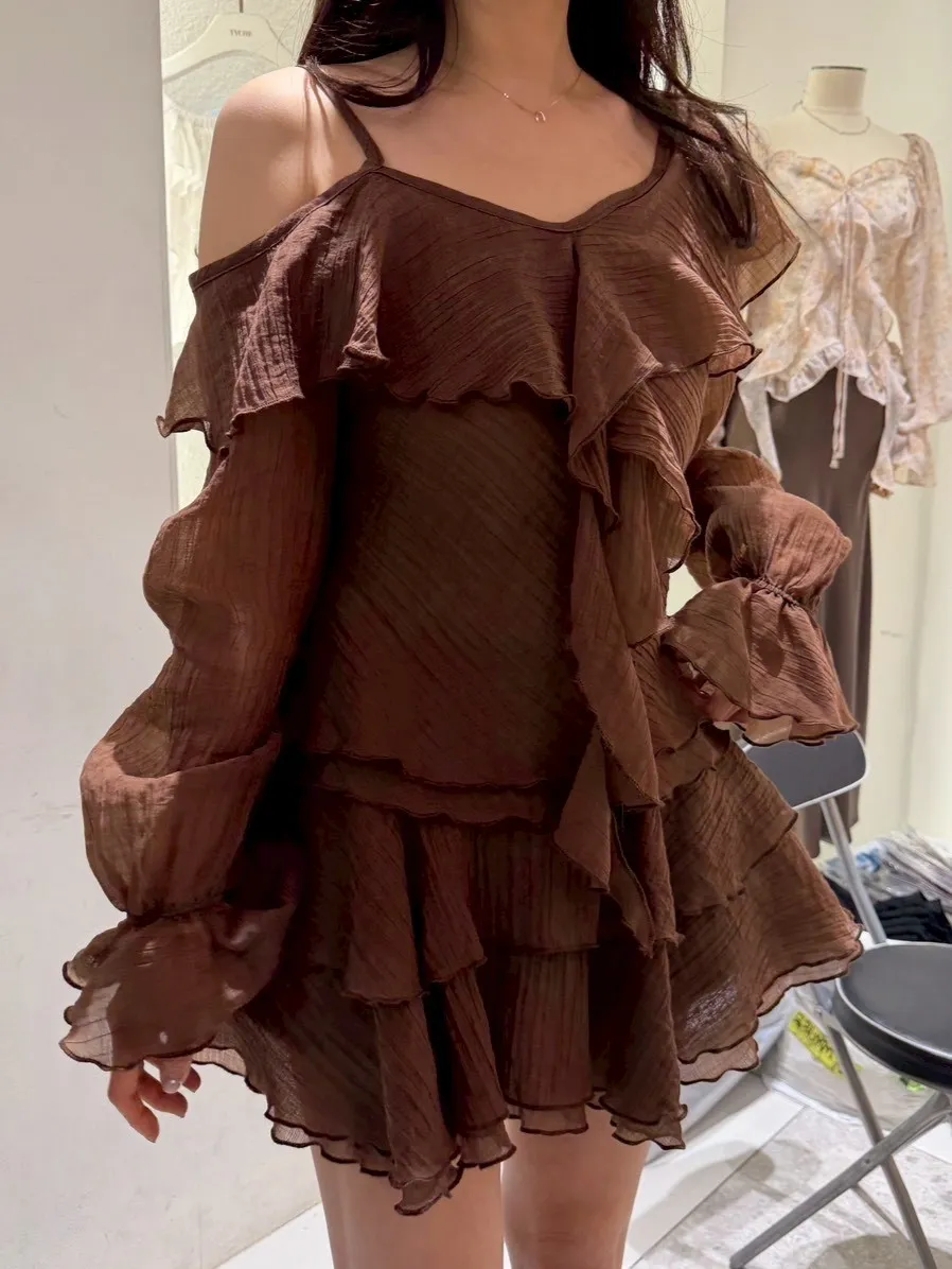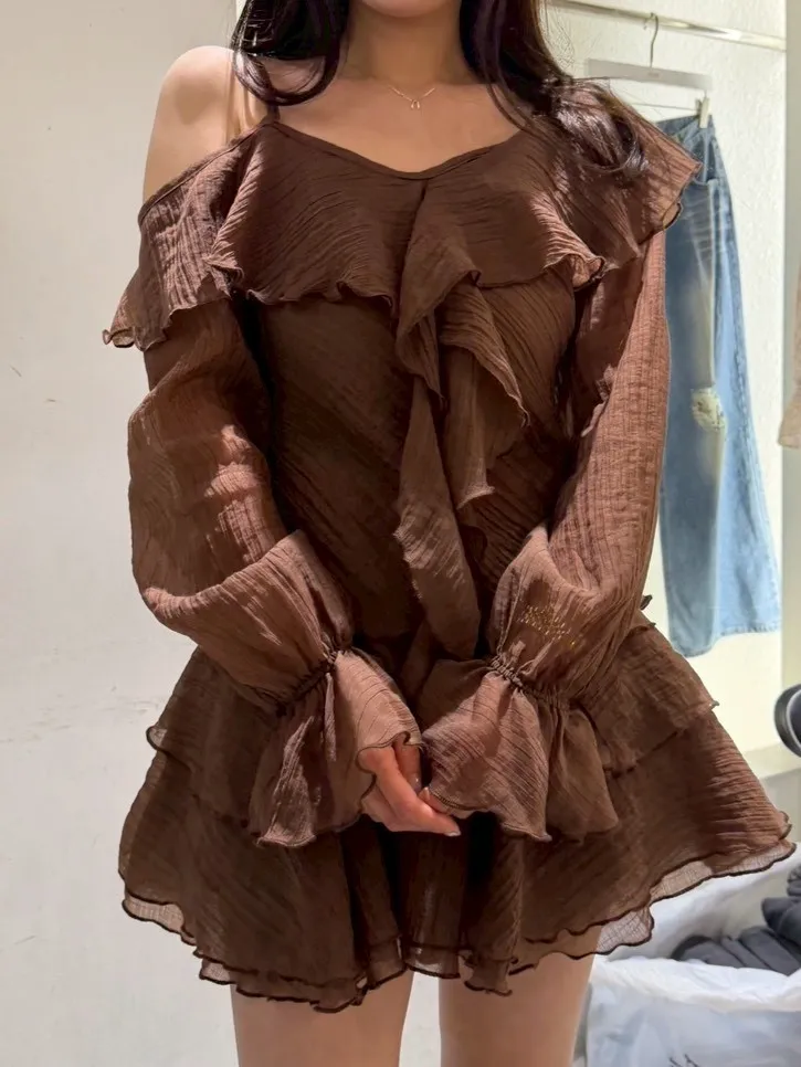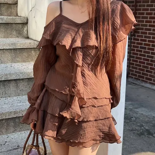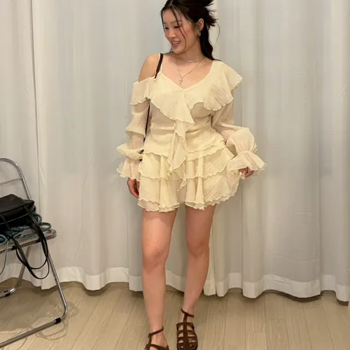 B3227 雪紡斜肩浪漫上衣/褲裙
