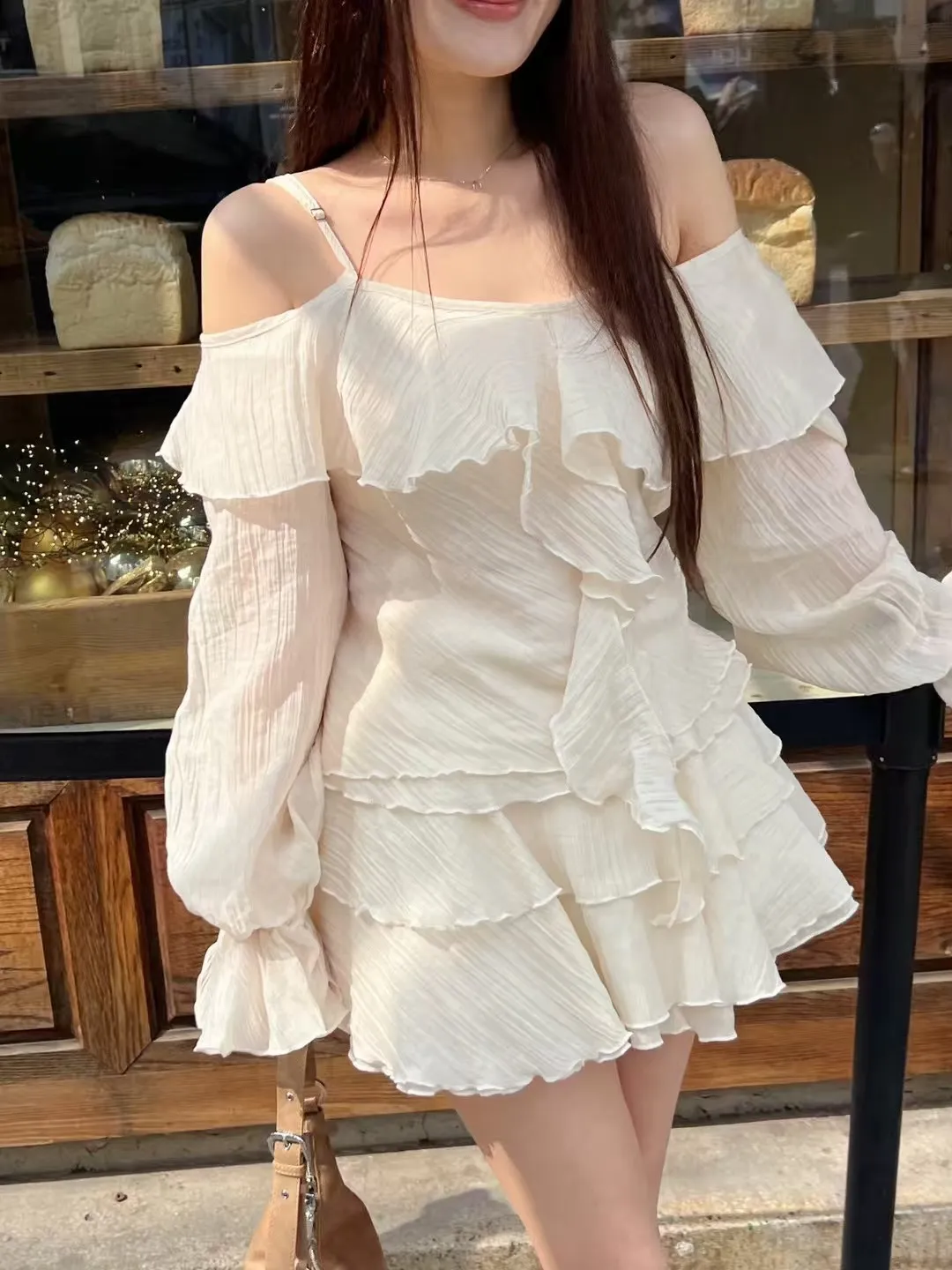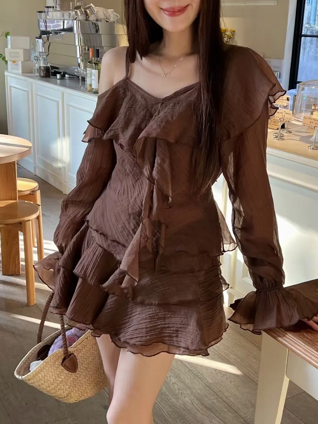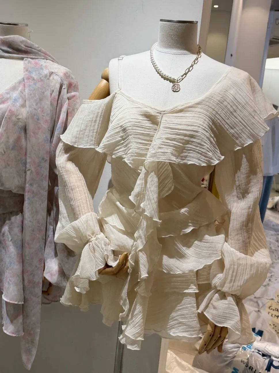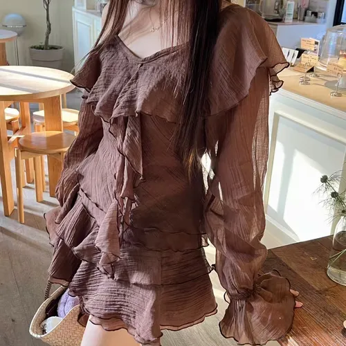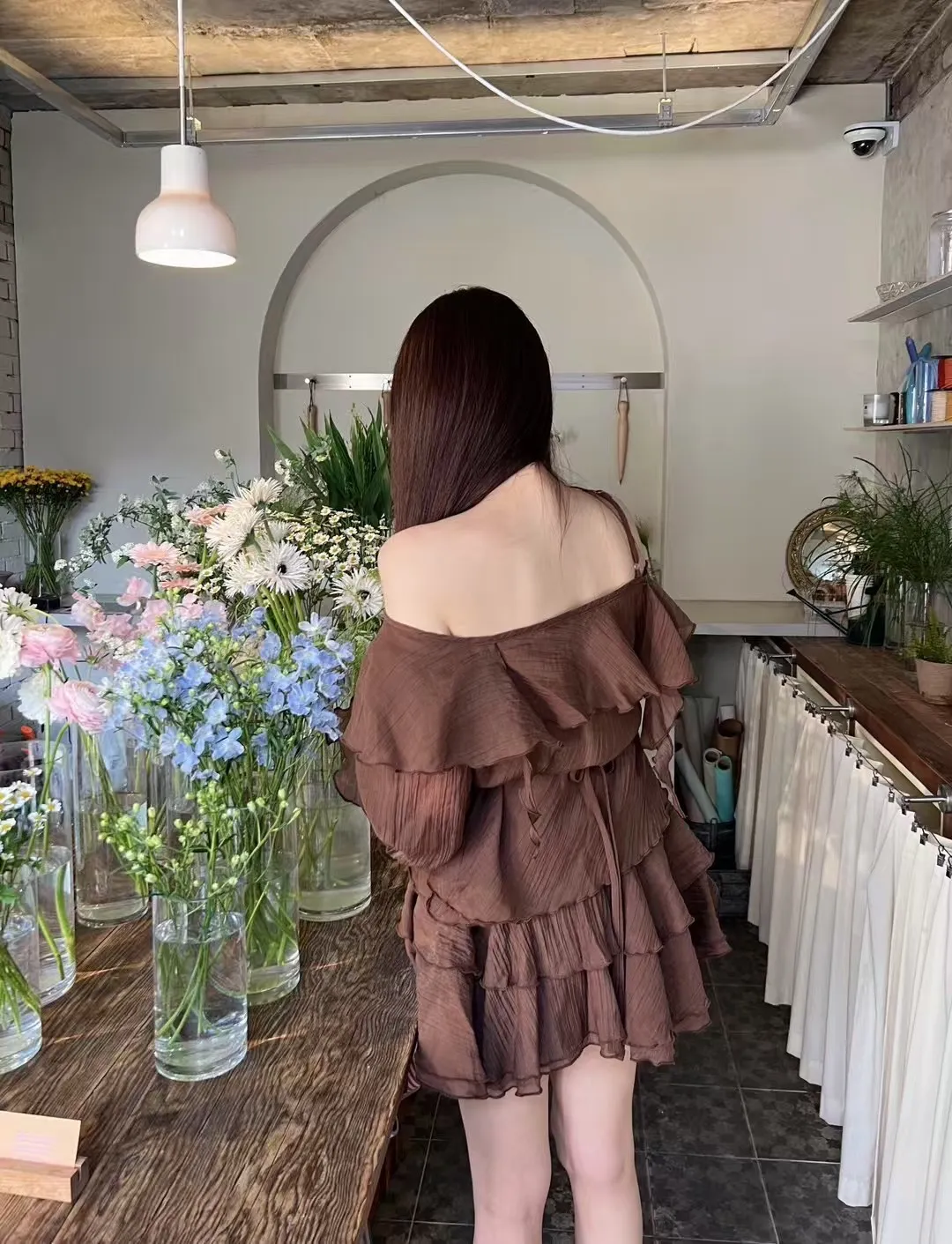 B3227 雪紡斜肩浪漫上衣/褲裙