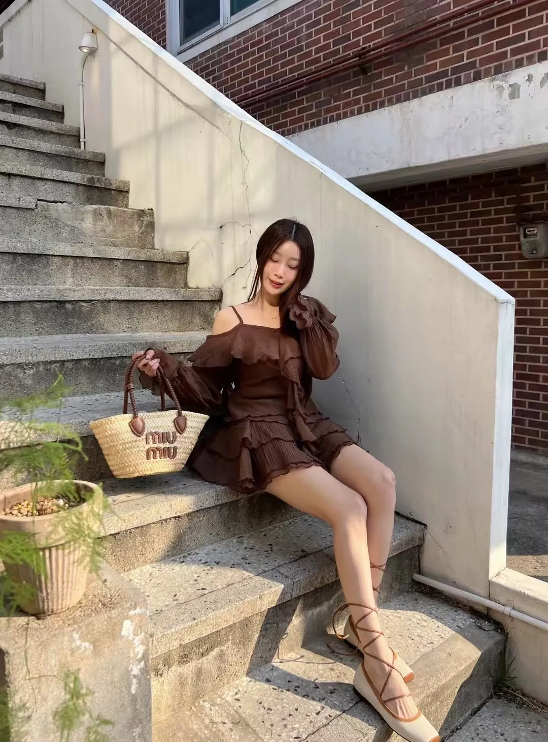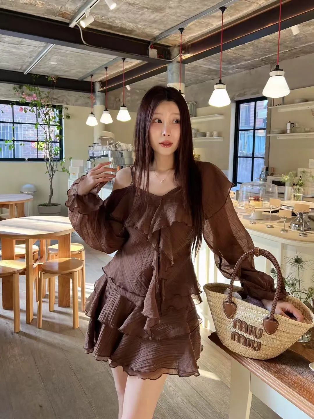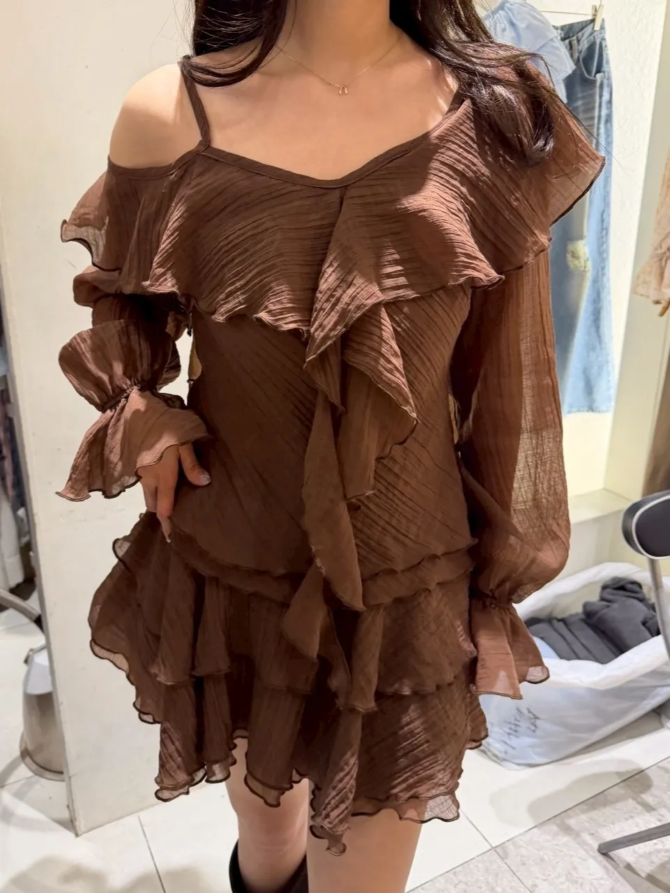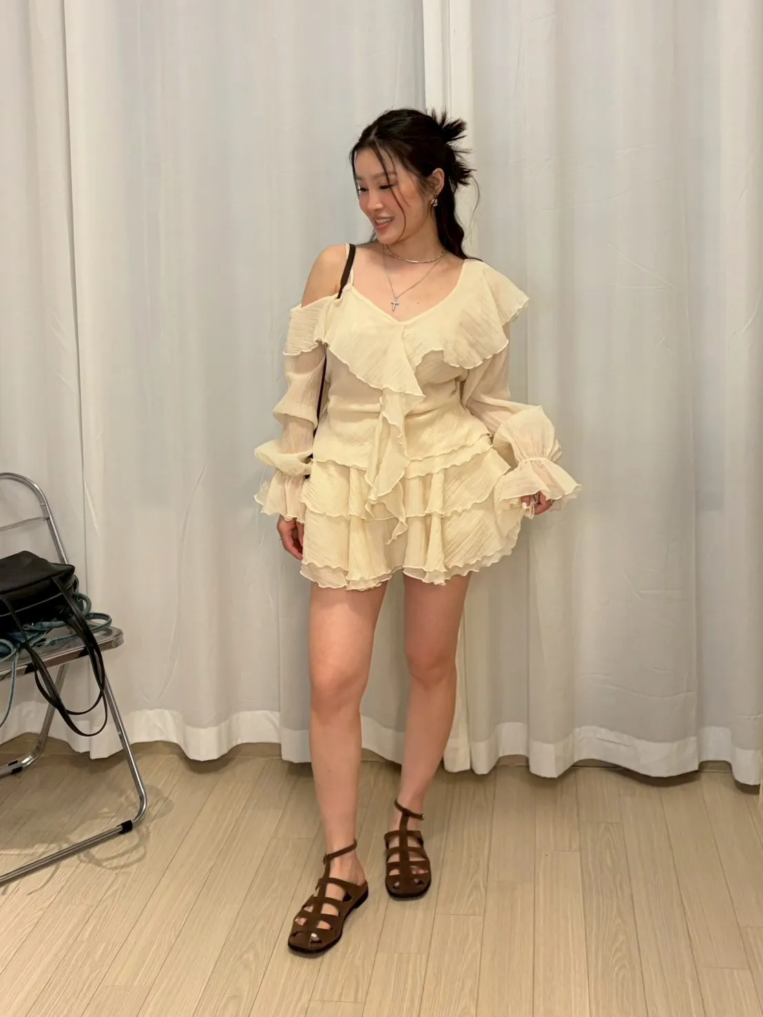 B3227 雪紡斜肩浪漫上衣/褲裙