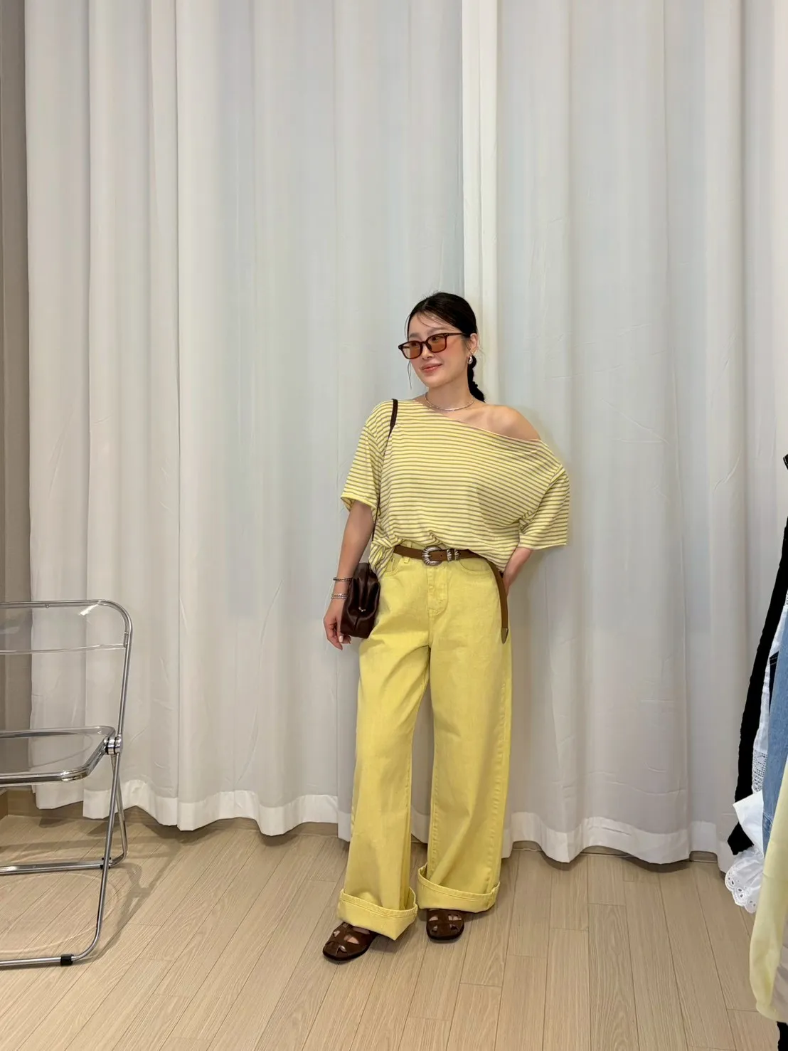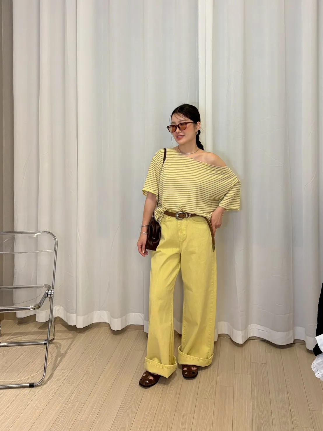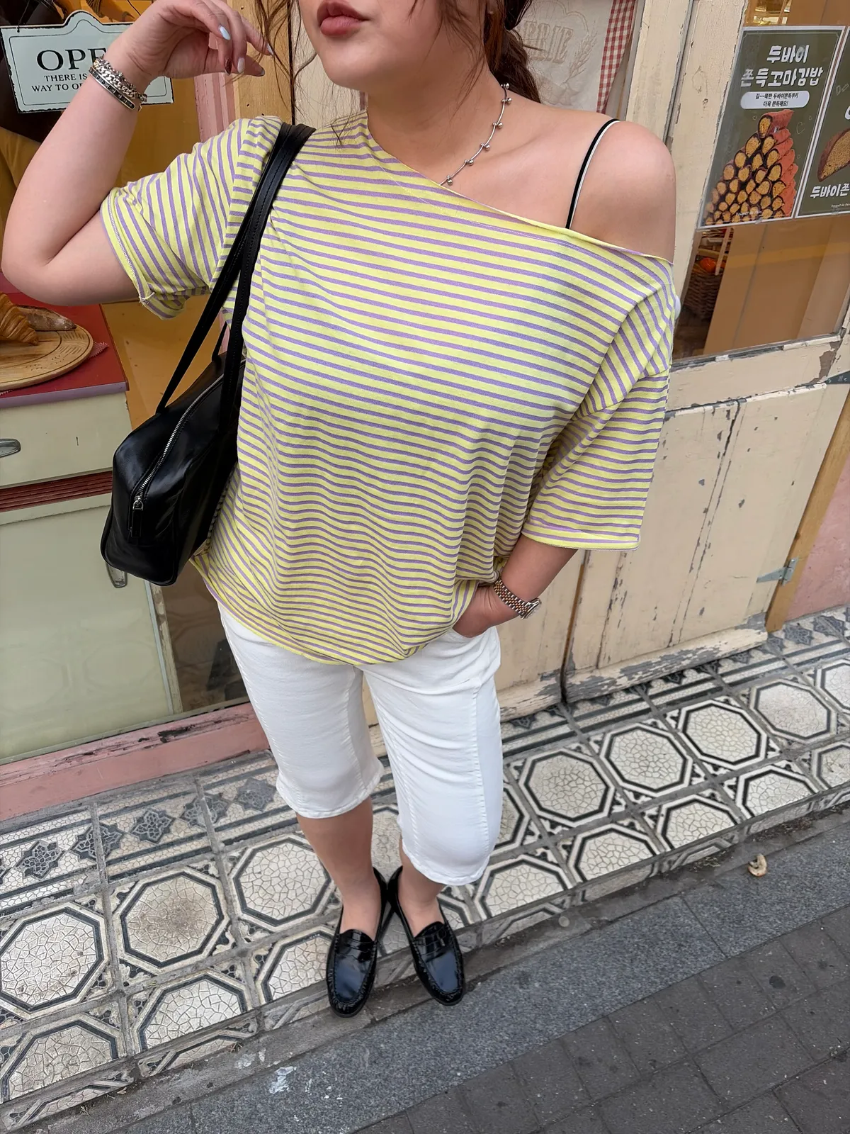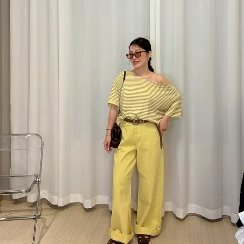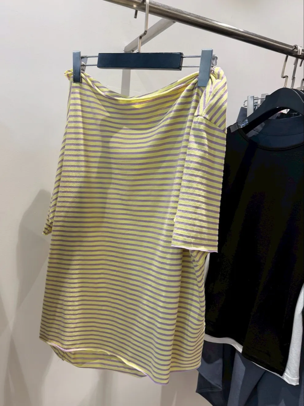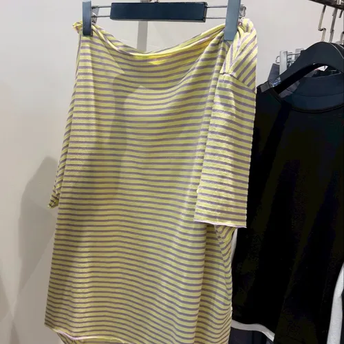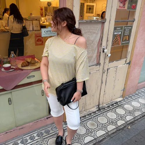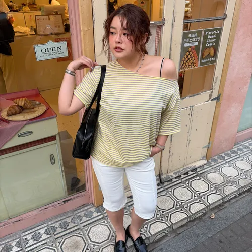 B3239 黃紫色斜肩tee