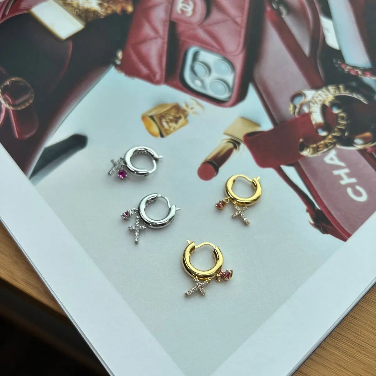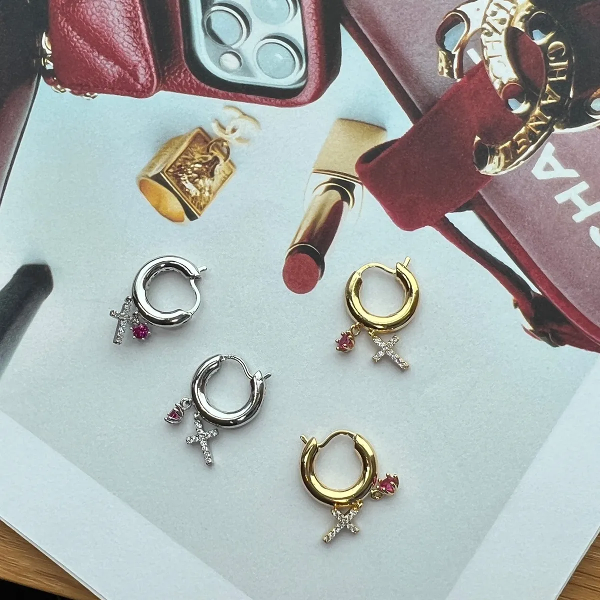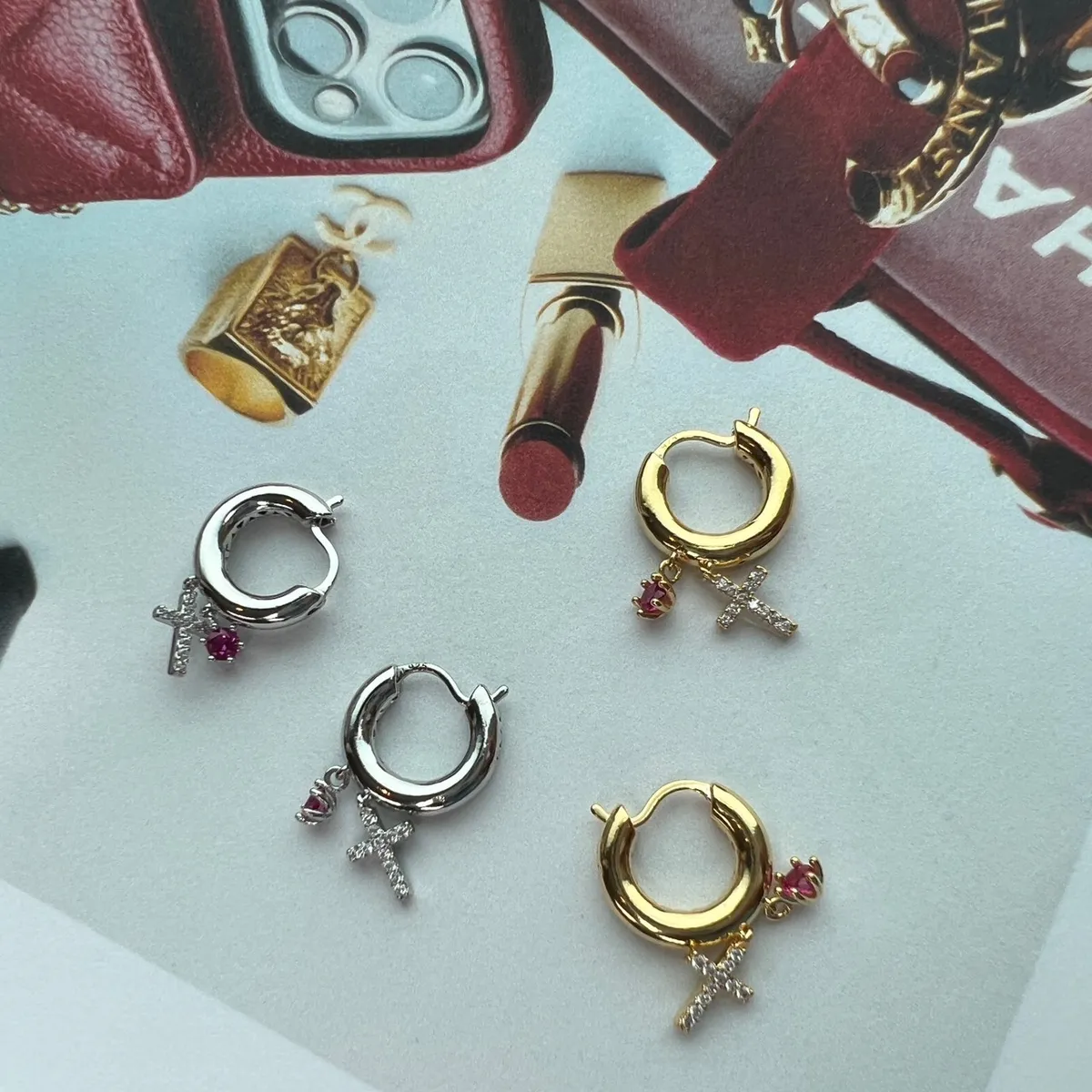 RR664 |純銀|桃紅鋯石/十字架耳環